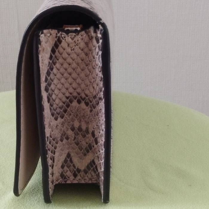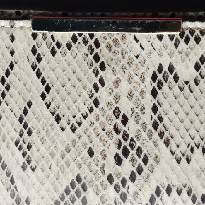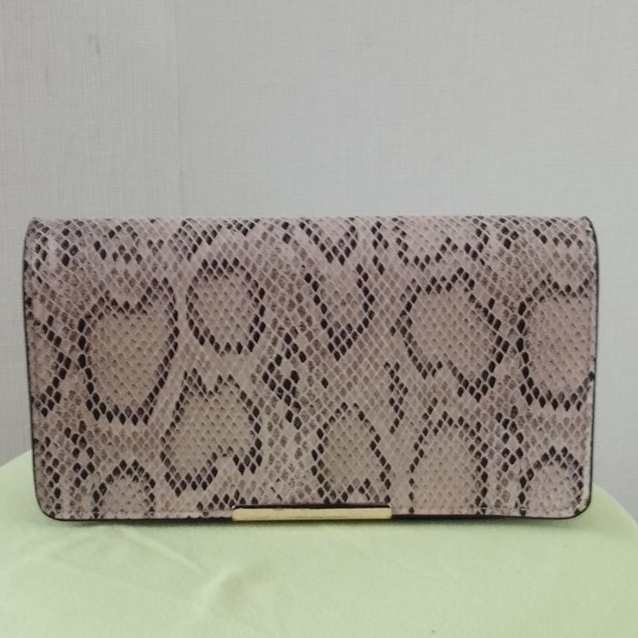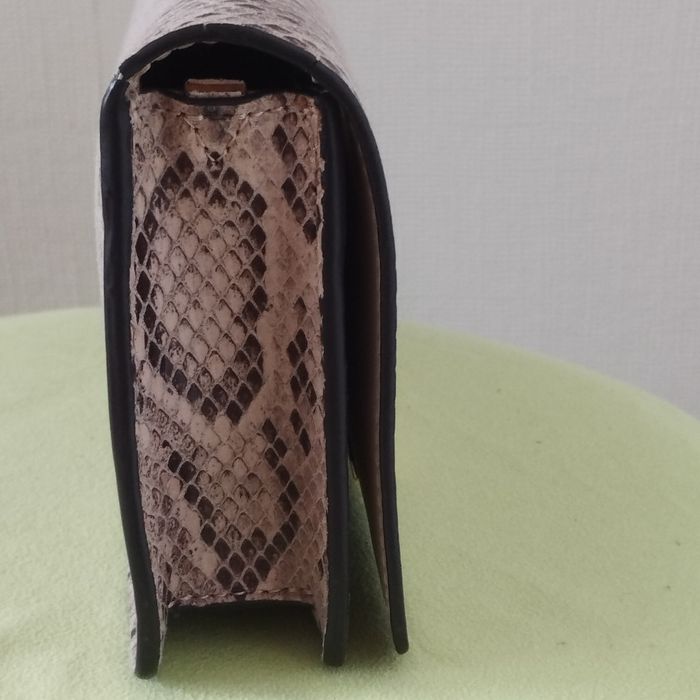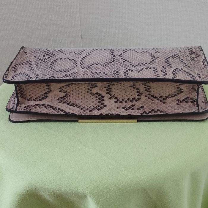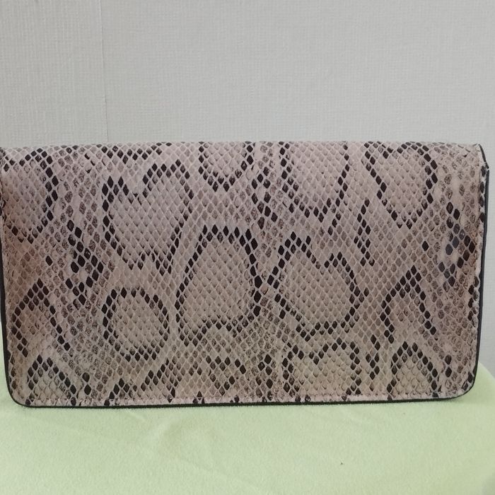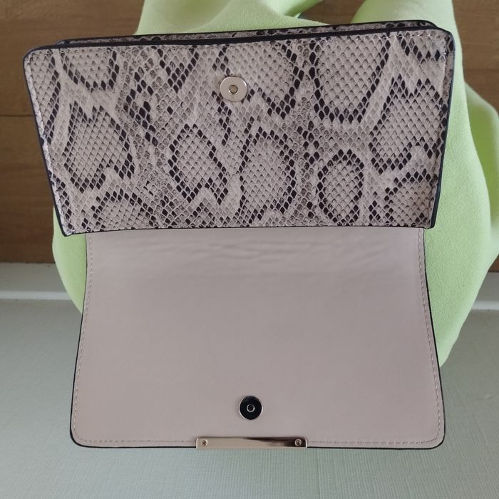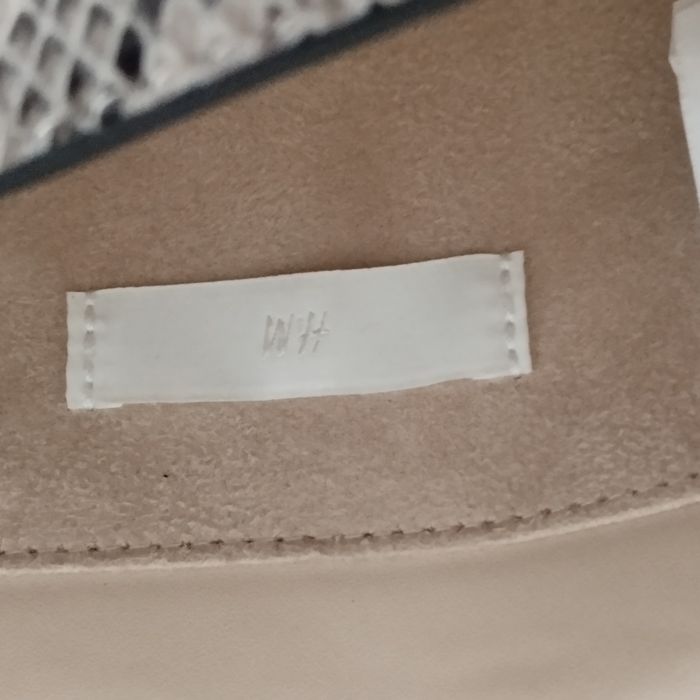 Sac pochette pour femme de chez H&M. Imitation lézard, coloris beige et marron, intérieur beige aspect daim. Fermeture bouton aimanté. Dimensions 22.5cm de longueur Hauteur 12cm. Profondeur 4cm. Comme neuf.