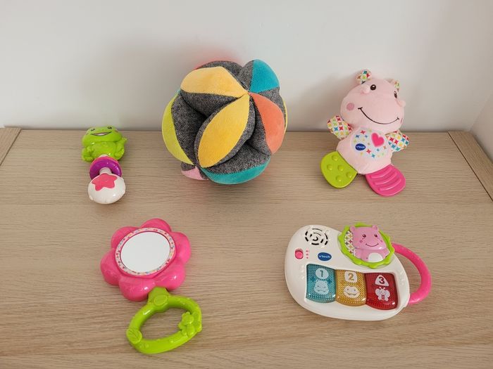 Lot de jouets plus adapté pour une petite fille (selon les couleurs). Ce lot contient des jouets variés pour amuser bébé et j'espère qu'il fera le bonheur d'une nouvelle petite puce. Tout est en bon état et fonctionne. Comprend majoritairement des jouets VTECH