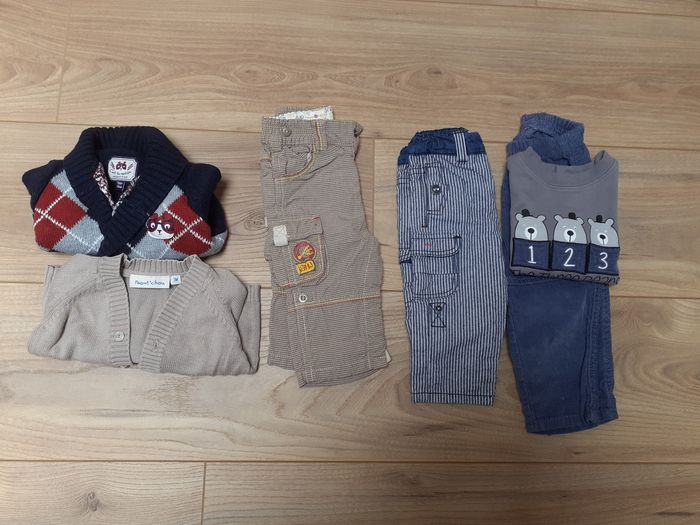 Lot pantalons: 1 bleu à rayures okaidi, 1 sans marque avec le sweet assorti, 1 beige sergent major. Lot 2 vestes: la bleu rouge et gris de marque sergent major, la beige kimbaloo. Le tout en très bon état Taille 3 mois