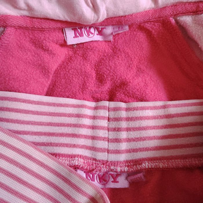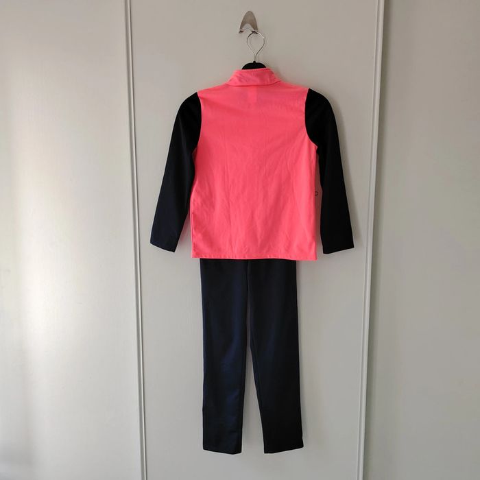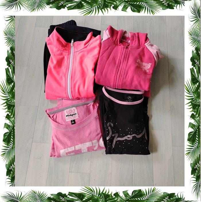 Lot comprenant : -1 ensemble polyester decathlon noir + fluo, pantalon + veste zippée. -1 ensemble coton chaud NKY, pantalon + veste zippée -1 t-shirt de sport manches longues effet 2 en 1, noir et rose -1 t-shirt long, rose #ladyminuit8ans