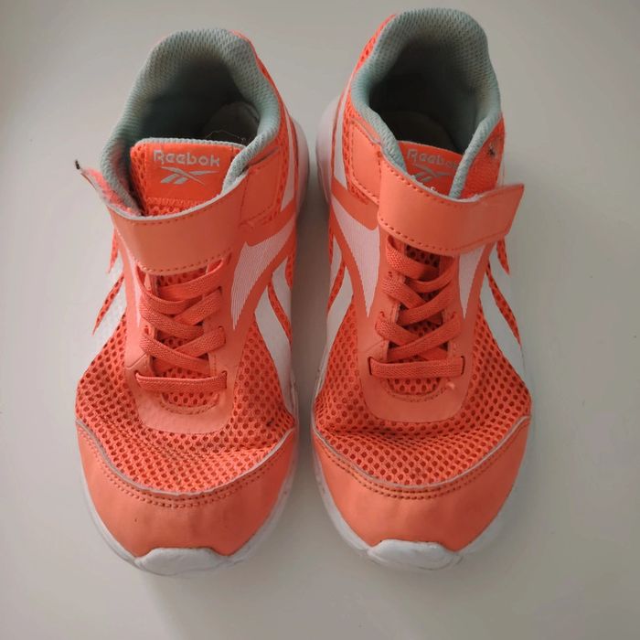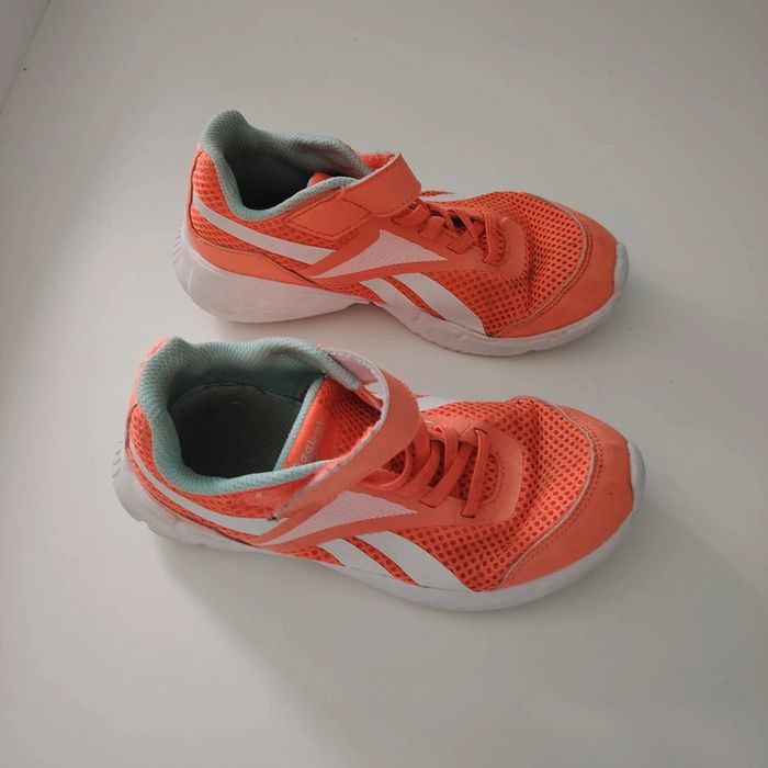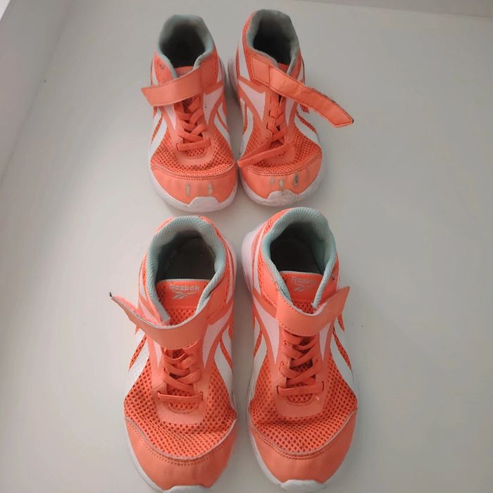 Lot de 2 paires de baskets identiques - 1 en très bon etat - 1 abîmée sur le bout mais parfaite pour jouer dans le jardin. Marque reebok
