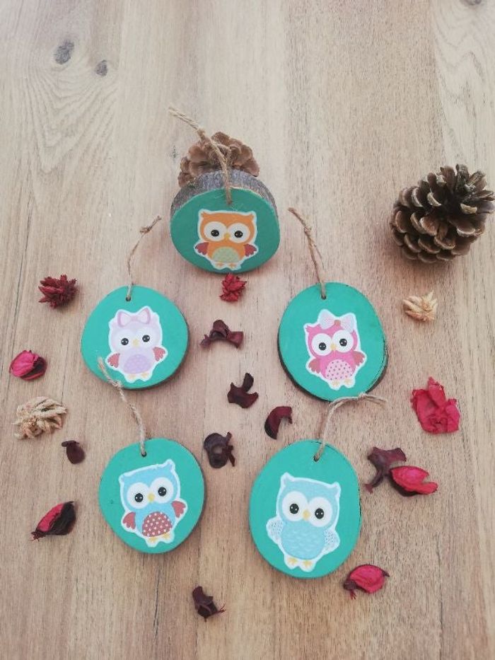 Lot de cinq suspensions pour la décoration. Matière : bois. Coloris : vert/multicolore. Dimensions : 6x7 cm (x2); 6x6 cm (x2) ; 6.5x6. D'autres modèles sur le dressing.