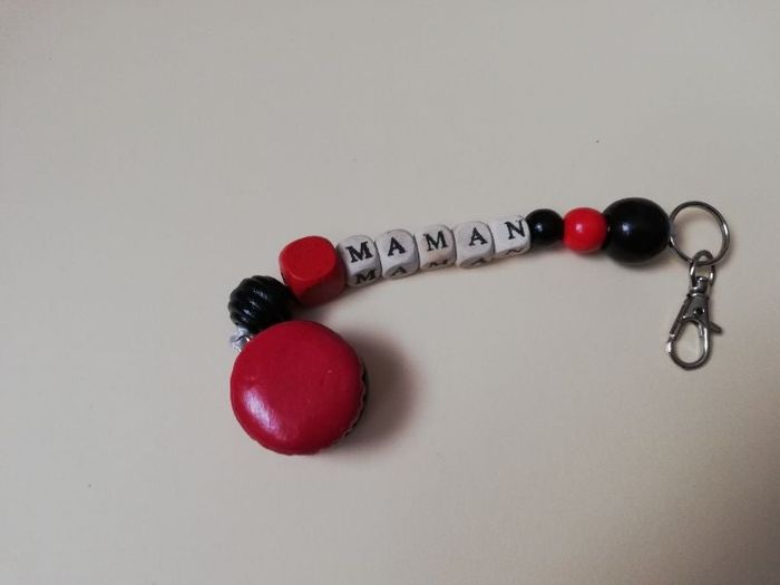 Porte clés mousqueton, idée cadeau pour la "Fête des Mamans" composé d'un macaron 2.5x1.8 cm, perles en bois, lettres en bois, coloris rouge/noir, anneau et mousqueton argenté. Longueur : 19 cm.
