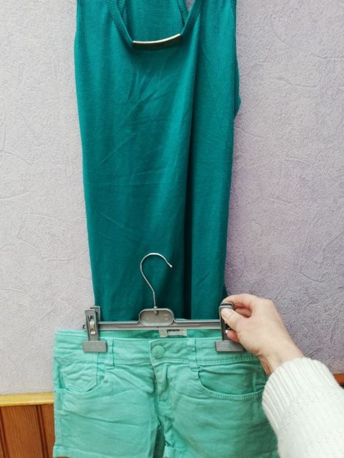 Lot d'un débardeur T.U et d'un short T.36 - Coloris vert turquoise et vert d'eau pour le short. Le short : bouton et zip - 4 poches de la marque Pimkie. Le débardeur est sans marque.