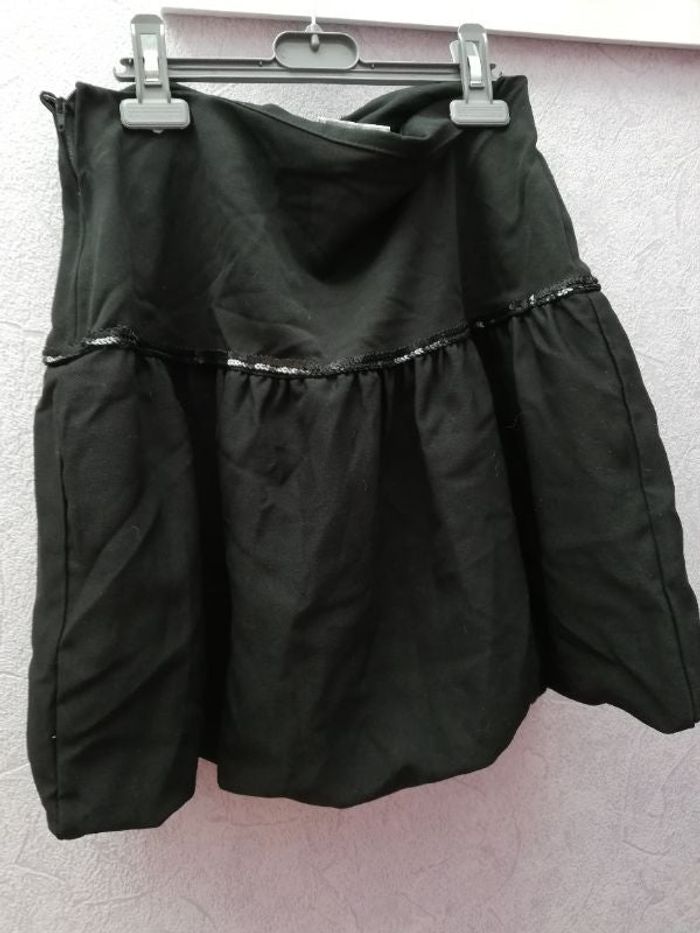 Jupe T.38, coloris noir, bouffante dans le bas, doublée, sequins tout autour, zip sur le côté, gros bouton fantaisie, marque Cache Cache
