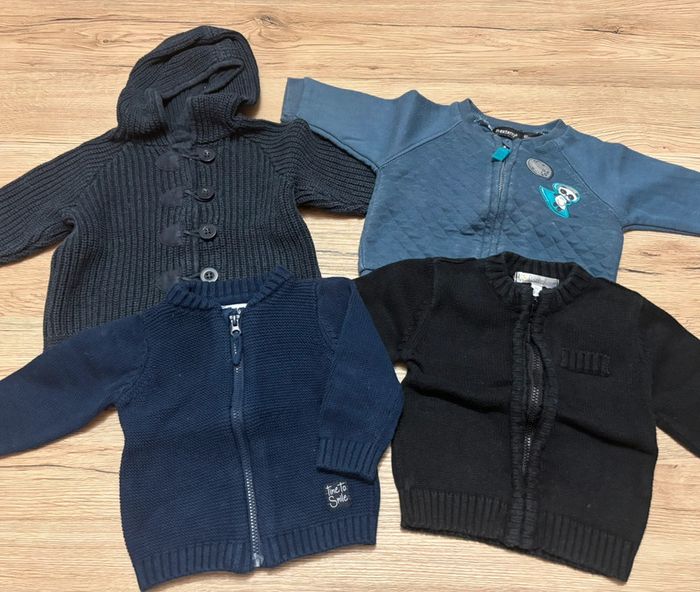 Lot de 4 gilets dont 1 avec capuche Taille 3 mois Quelques traces d’usures, bien portés Marques : GEMO, IN EXTENSO, KITCHOU #bluecat_elian_3mois Possibilité de réduction selon lot N'hésitez pas à me contacter si vous avez des questions 😊 /!\ envoi rapide et soigné /!\ Tous les articles sont inspectés une nouvelle fois avant envoi /!\ Les vêtements sont stockés dans un carton, dans une penderie /!\ Maison non fumeur