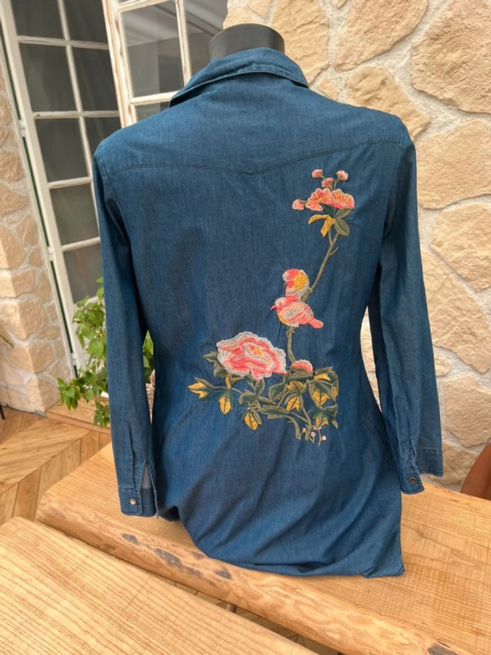 Robe chemise femme Taille L mais convient plutôt pour du M Ciminy Paris Magnifique fleurs et oiseau dans le dos Deux poches latérales Couleur Jean Achetée 39€ en boutique indépendante