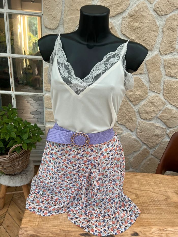 Jupe d’été taille S / 36 violet Lila corail En voilage doublé à fleurs Marque Suzy & Milly Ceinture neuve pour 5€ de plus Débardeur non disponible