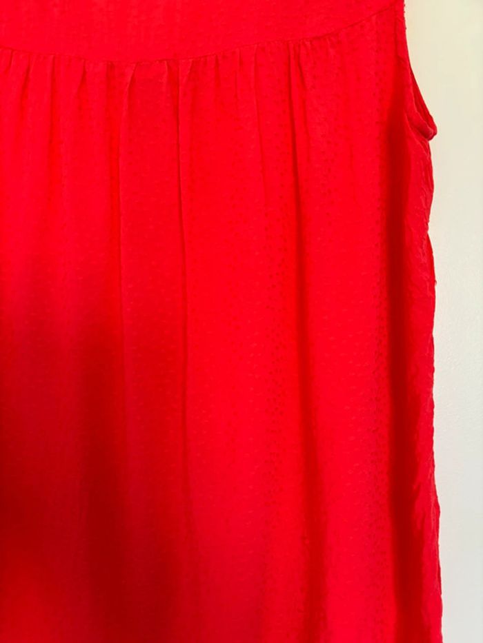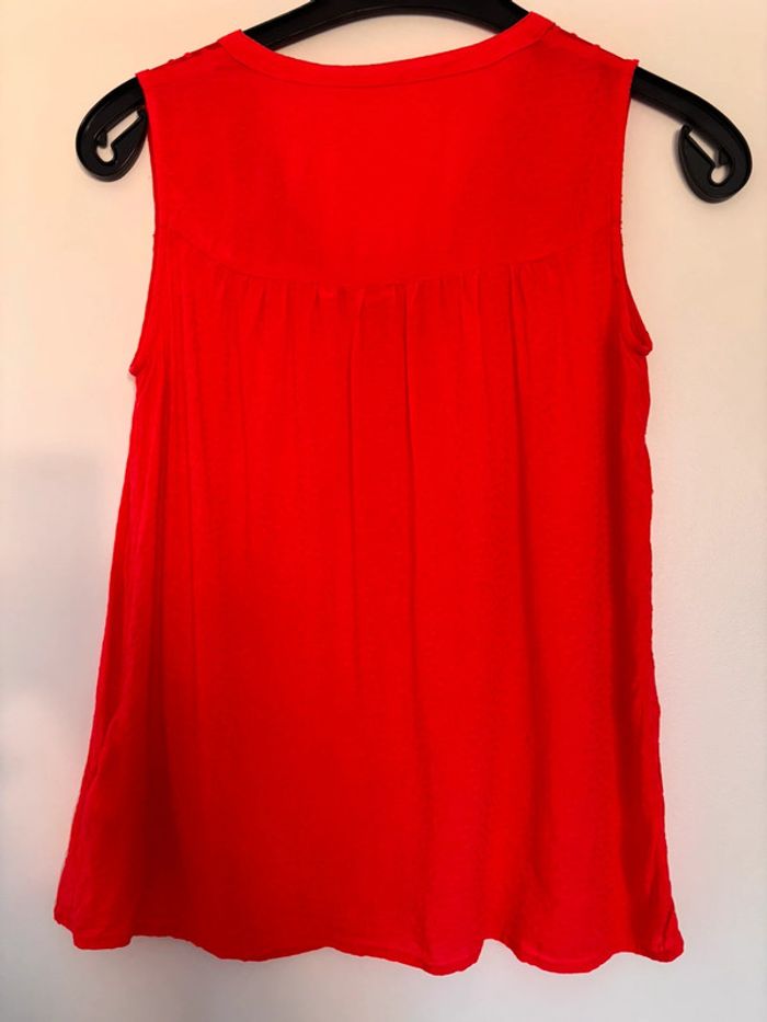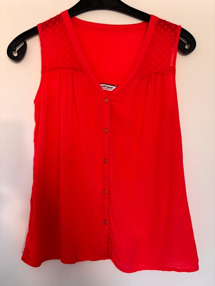 Chemisier très fluide et léger sans manche Coupe droite, col en V Tissu qui ne froisse pas ! Dentelle sur le haut et boutons devant a motif doré (un bouton de rechange sur l’étiquette) Tissu original a petits points Excellent état comme neuf Marque Nafnaf et taille 36 Matière 100% viscose #nafnaf #nafnaf36 #chemisier #chemisefemme #orange #hautfemme #chemisefemme #chemisierrouge