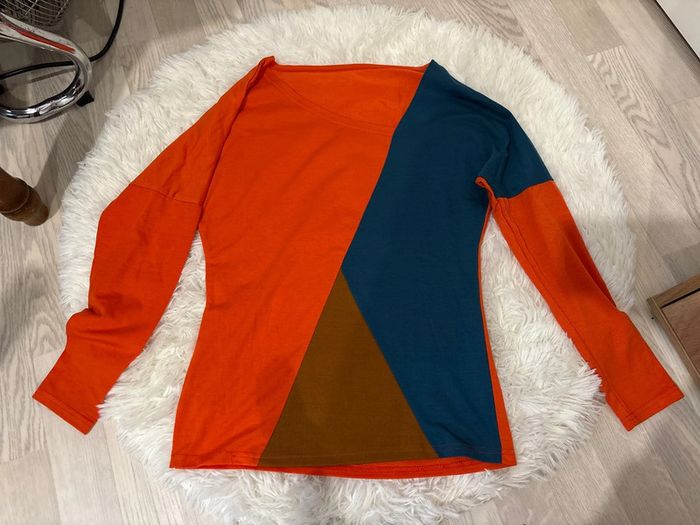 Joli tee shirt léger, col asymétrique Couleur orange, bleu et marron. Manches longues tombant coupe droite. Taille 36 Excellent état très peu porté #teeshirt #teeshirtfemme #teeshirtmancheslongues #femme36