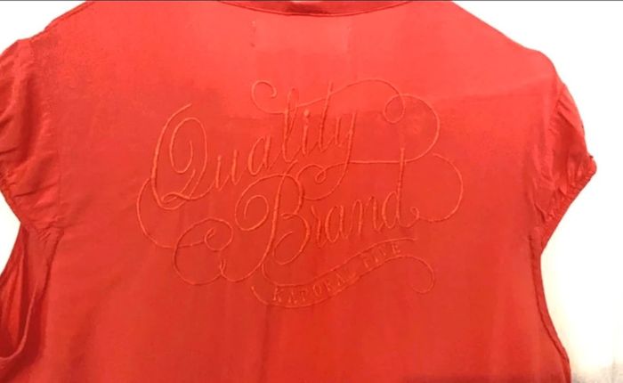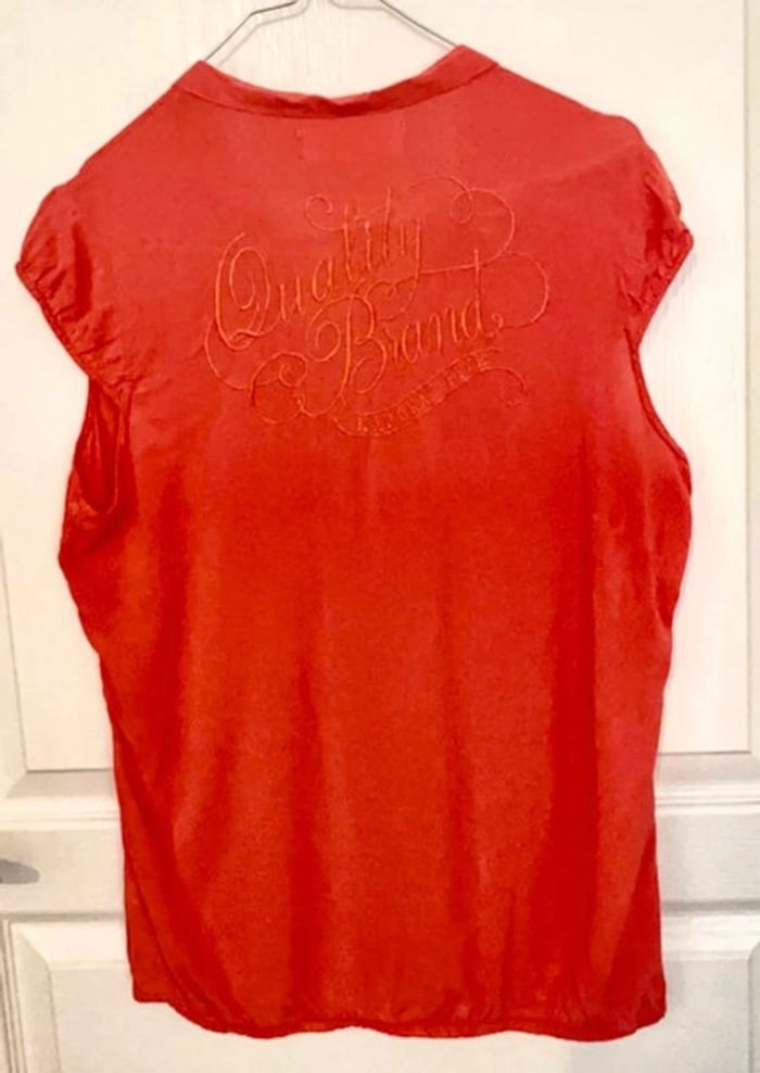 Chemisier avec petites manches sur l'épaule, de marque Kaporal avec 2 poches sur la poitrine. Écriture calligraphique dans le dos. Boutons sur le devant effet bois. Chemise resserrée en bas par un élastique. Taille XS qui correspond également à un S. Matière 100% viscose, très douce au toucher et agréable à porter. Article en très bon état. #kaporal #kaporalfemme #chemisier #chemisefemme #chemisierorange #chemisierxs