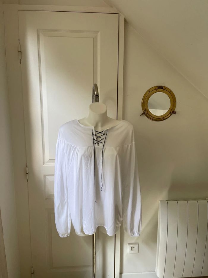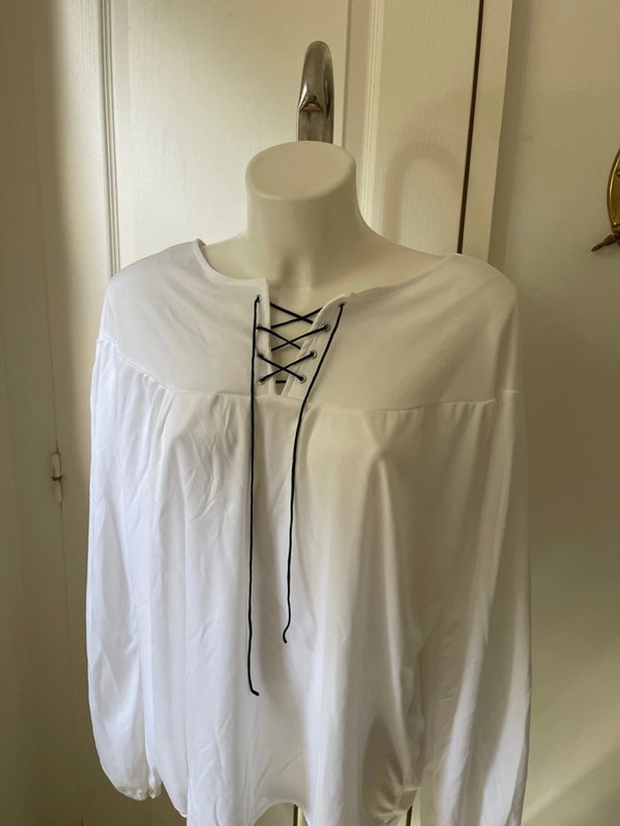 Blouse blanche avec cordon noir. Matière souple et légère. Taille 46/48. C12. #taille46 #taille48 #blouse #blouseblanche
