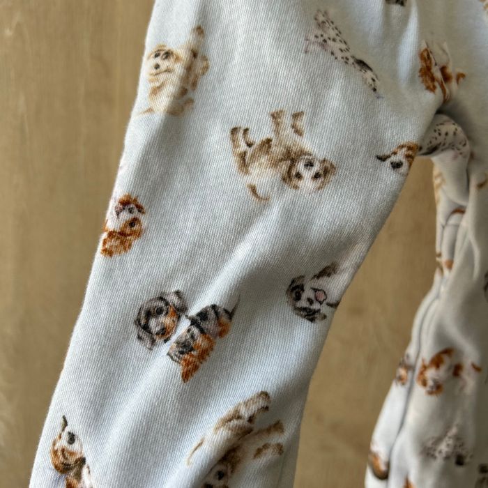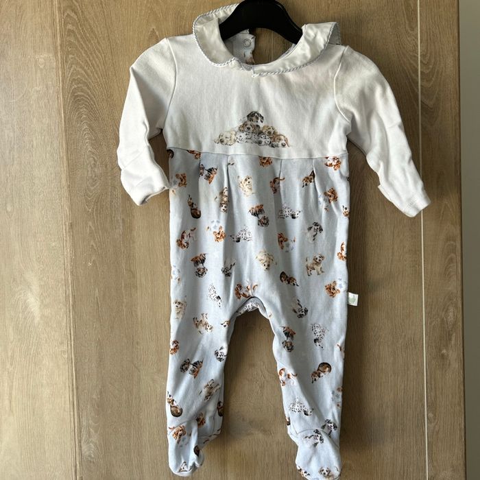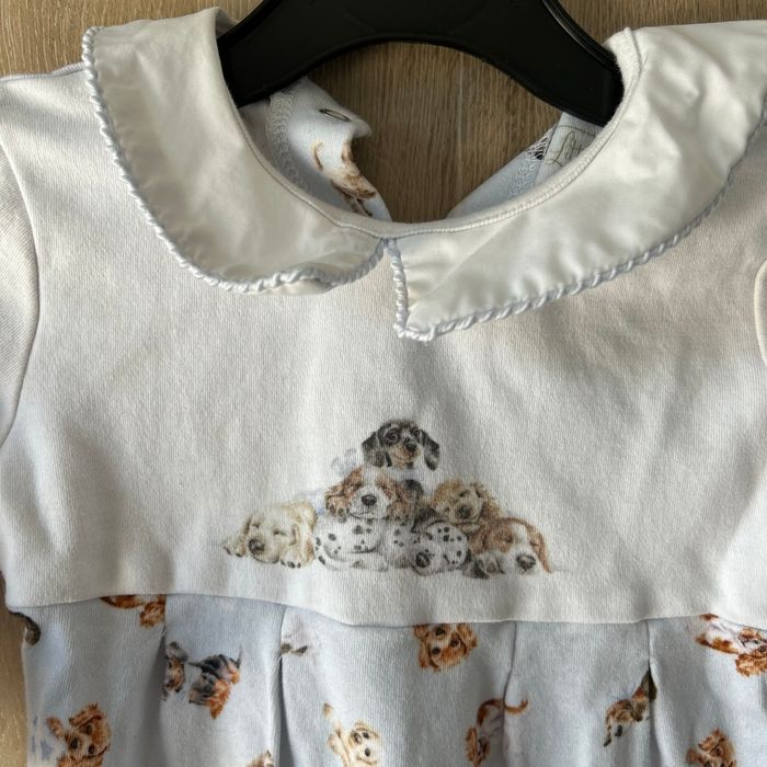Grenouillère pouvant convenir fille ou garçon Neuve jamais porté taille 3/6 mois marque Little Wren acheté dans une boutique indépendante Blanche et bleu clair avec motifs de chiots Joli col avec belles coutures.