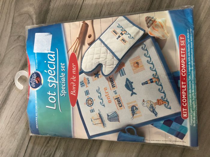 Kit de point de croix complet qui comprend: 1 gant à broder toile aïda blanche 7pts, 1 coupon de toile aïda blanche 7 pts 40x50cm, les fils de coton, l'aiguille, la grille du motif et l'ensemble des explications pour réussir l'ouvrage Thème Bord de mer Marque De fil en Image