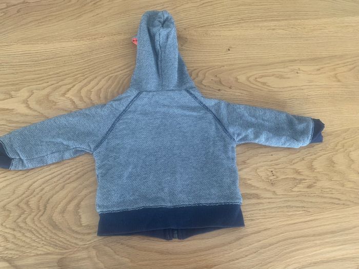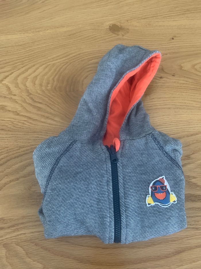 Gilet à capuche, zippé, bleu marine, à très fines rayures. Neuf, jamais porté.