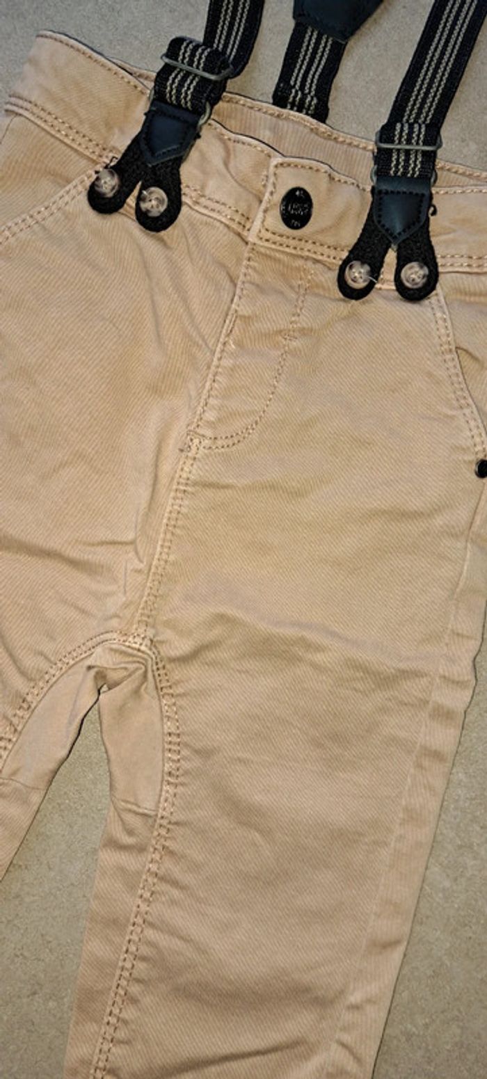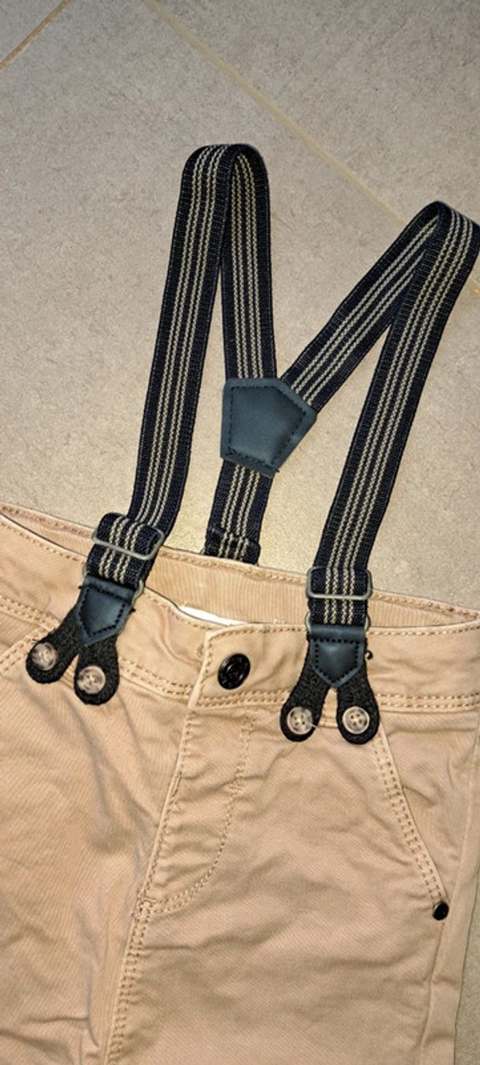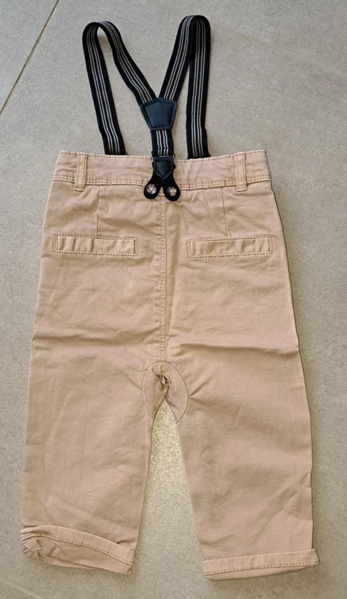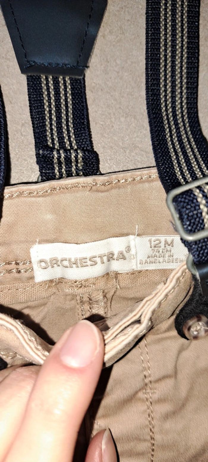 Pantalon crème avec bretelles bleu marine en taille 12 mois. De la marque Orchestra. En très bon état. Ceinture de serrage interne.