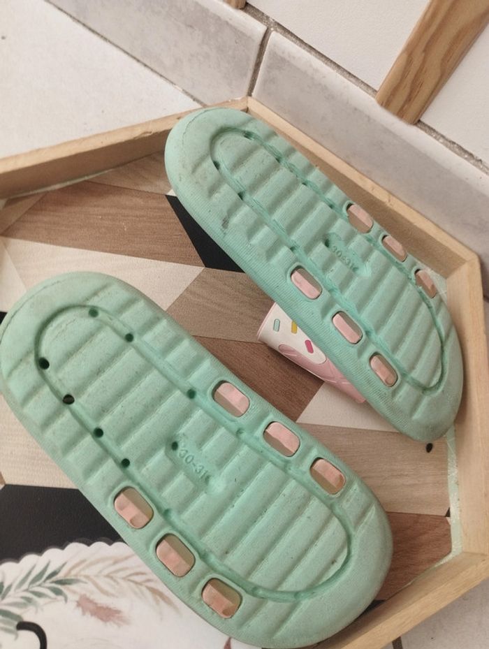 Claquettes confortables facile à nettoyer couleurs pastel mint et rose . Taille 30/31 . Bon état portées souvent pas de défaut particulier. A vendre 3€ *Vendu uniquement dans un lot* ** Tout achat seul sera annulé** --------------------------- ✏️Informations générales ✏️ 📩Expédition dans la journée en général -hors weekend. 🚭Maison non fumeur / sans animaux 📅Pas de réservation 📸Pas de photo porté 👛 Bon plan Envoi à 99ct (+20% récupéré en bon d'achat) possible uniquement pour les français- me contacter pour plus d'infos 😉 #alfaagain30shoesfille #alfaagain31shoesfille