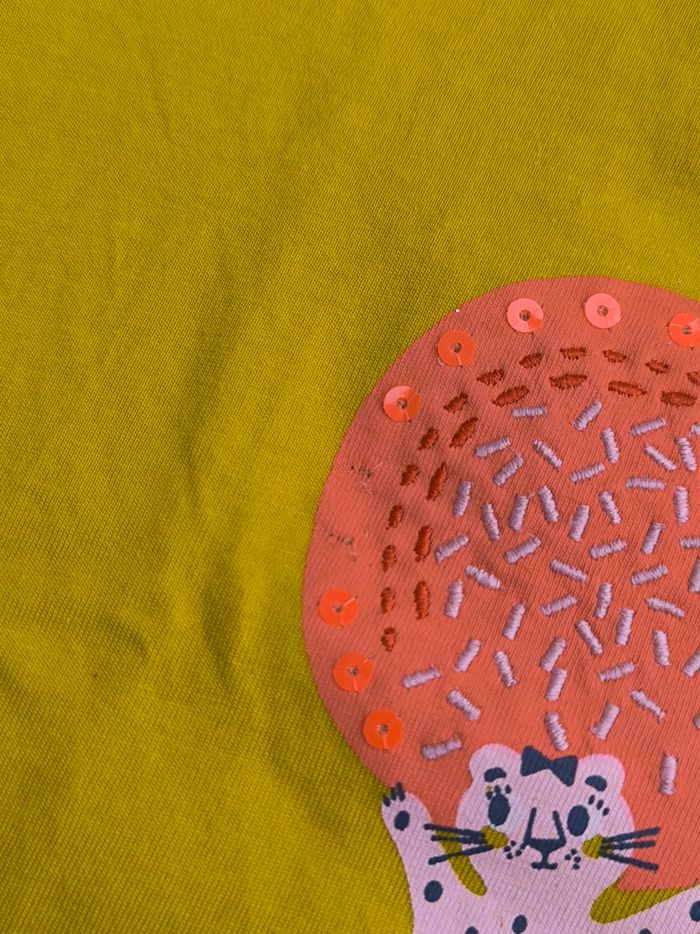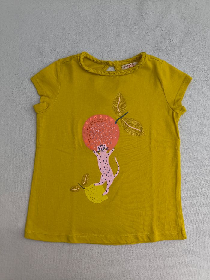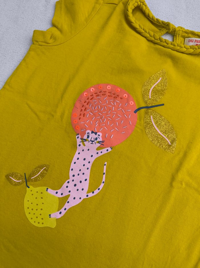 T-shirt à manches courtes Marque Du Pareil au même Taille 3 ans, 98 cm • Coloris jaune, rose, doré... • Imprimé léopard avec fruits, broderies et sequins • Col tressé • Goutte au dos avec bouton • Tissu fin • Manque 2 sequins En très bon état #evelyne_filles_3ans #evelyne_filles