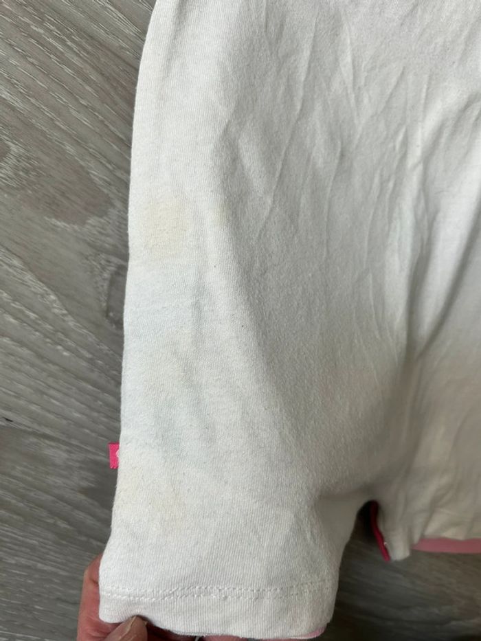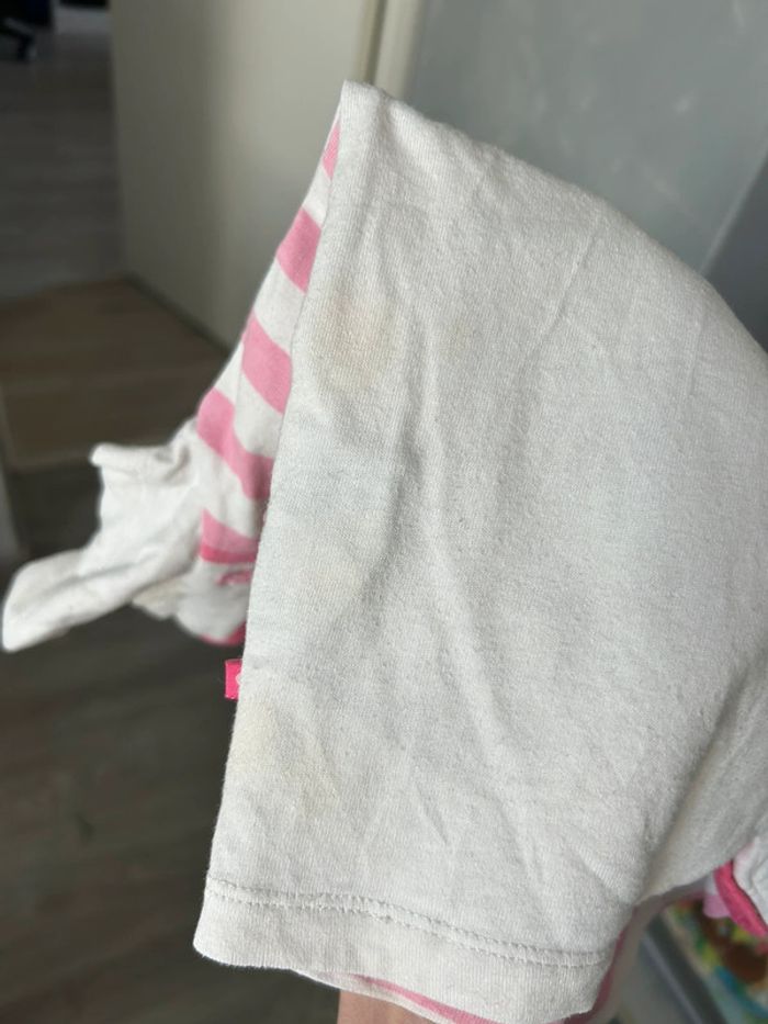 Combishort minnie taille 18 mois il y a une petite tache sur le devant et 3 légères taches orange derrière sur un côté voir photo 2 et 3 et la dernière de l’annonce