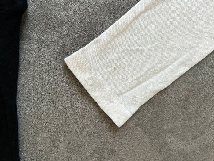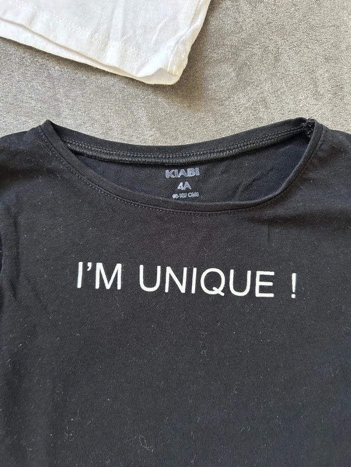 Lot de 2 tee shirt inscription petite tache sur le blanc devant et sur le bout d’une manche et bon état pour le noir taille 4 ans voir photos
