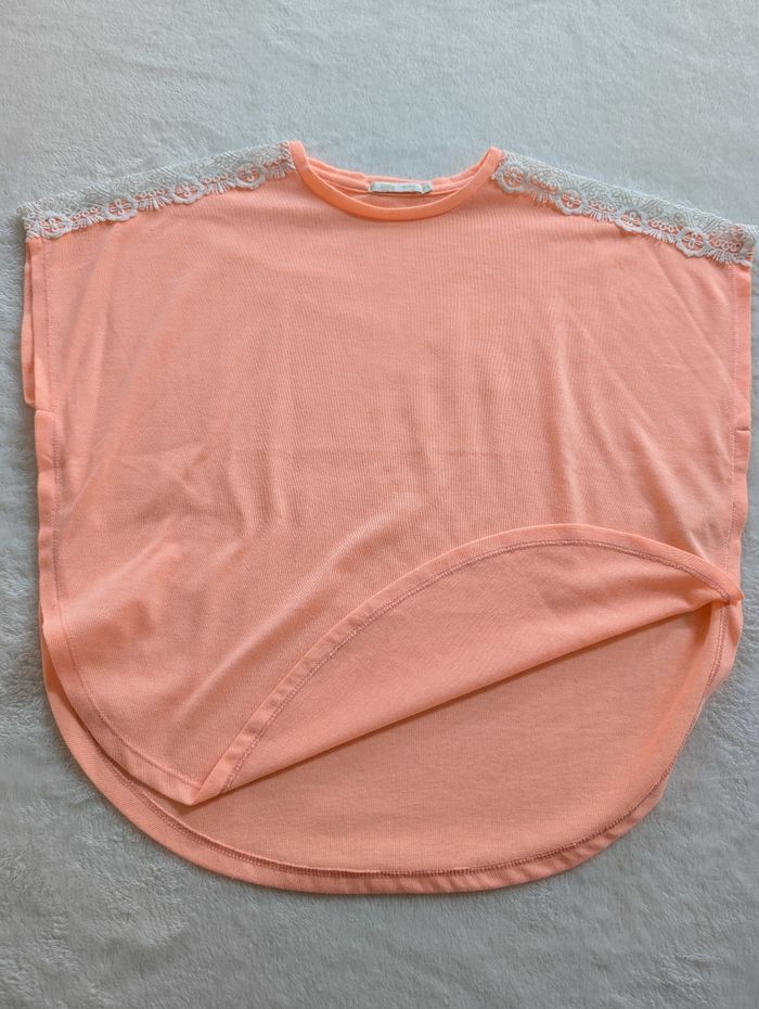 T-shirt corail Forme style poncho mais cousu sur les côtés. Bas arrondi Broderie sur les épaules Tissu effet laine très fine Taille 14 ans