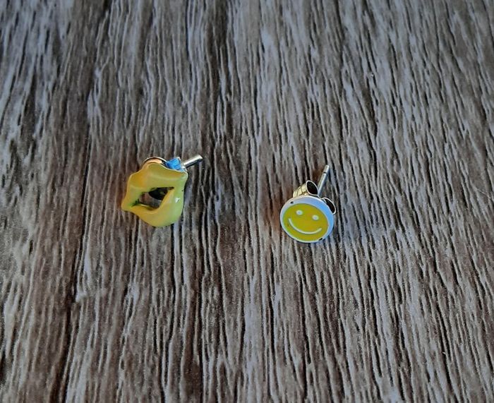 Boucles d'oreilles fantaisie de couleur jaune Forme bouche (1 cm) et smiley (0.6 mm) #grosmairebijoux, #bouclesdoreilles, #clousfantaisie
