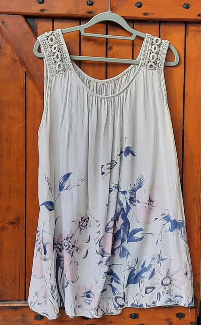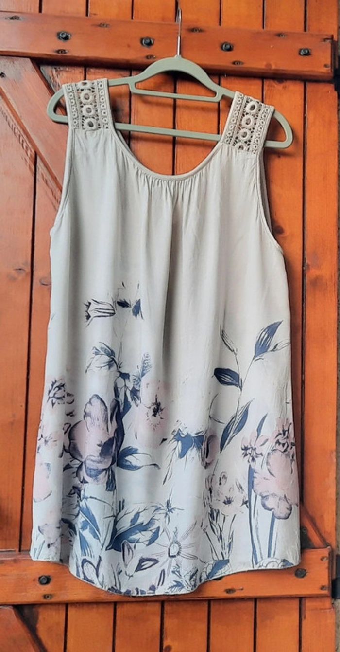 Top sans manche beige à fleurs bleues et roses, forme évasée Sans marque, taille 42 Largeur sous les aisselles 60 cm Hauteur 78 cm