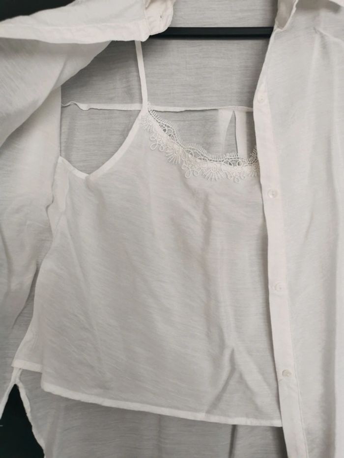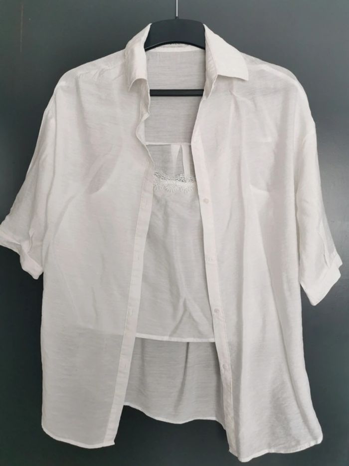 Chemise taille XS oversized avec débardeur intégré, tissu fin.