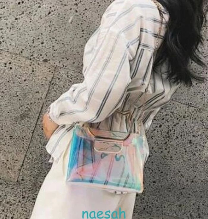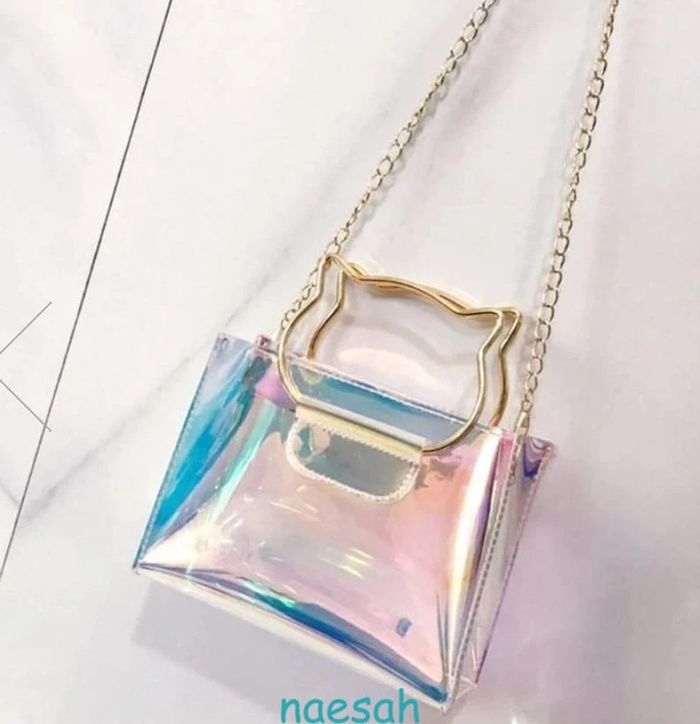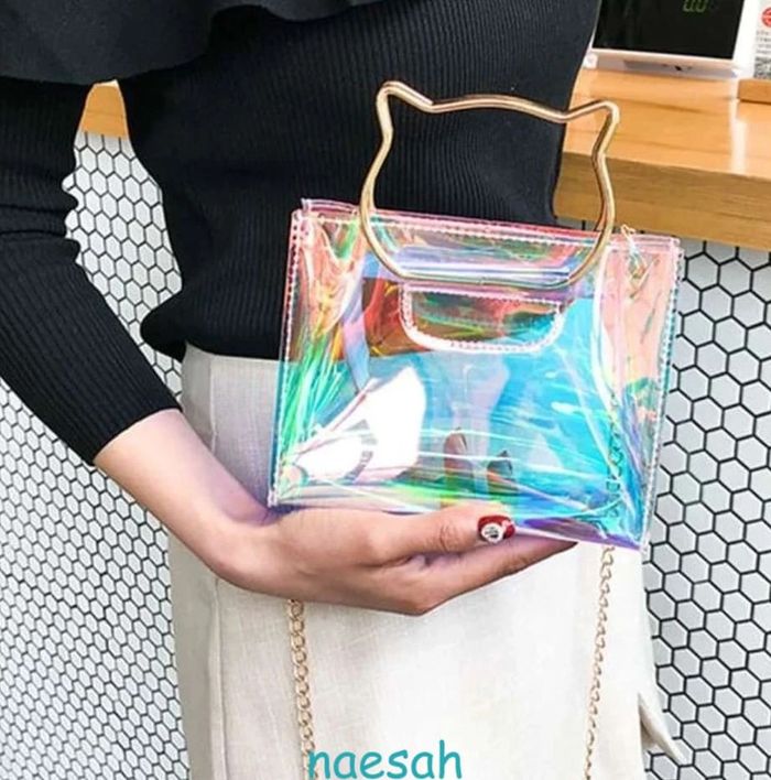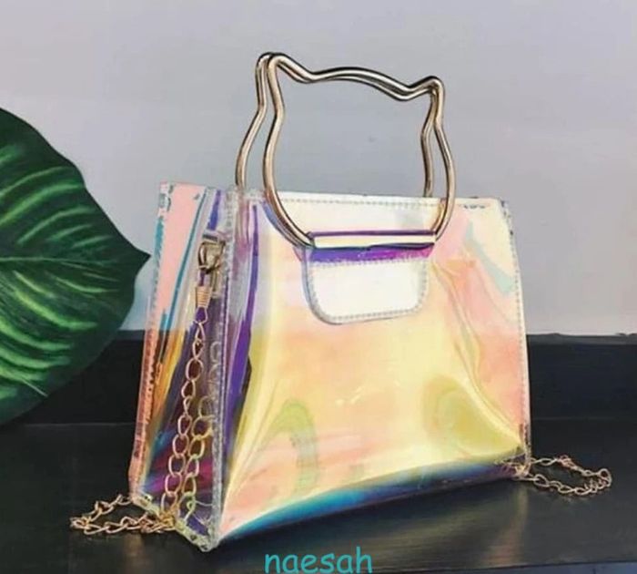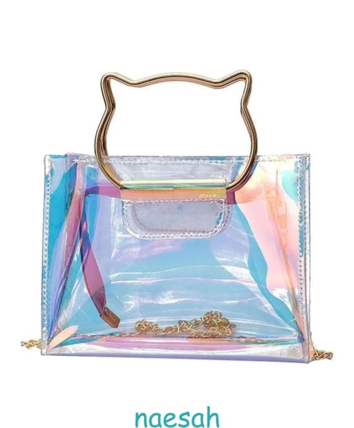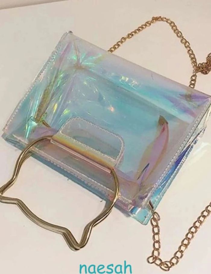 Article neuf sous emballage Sac à chaine irisé avec poignet Design Chat. Ultra tendance en PVC transparent effet laser avec ses reflets irisés "hologrammes", ce qui a pour effet de camoufler le contenu du sac 😉 Fermeture par zip, chaine dorée de 120cm Dimensions : L 19cm x H 17cm x l 8cm Livraison soignée et réduction sur les lots 👍 #naesahsacs Sac bandoulière original amoureux des chats chat chaton oreilles de chat soirée fiesta chic élégant élégance classe accessoire accessoires femmes filles adolescente ados outfit mode fashion fashionista féminin élégant femme idée cadeau de Noël neuf anniversaire saint Valentin amour passion couple amitié bestfriend mère fille maman