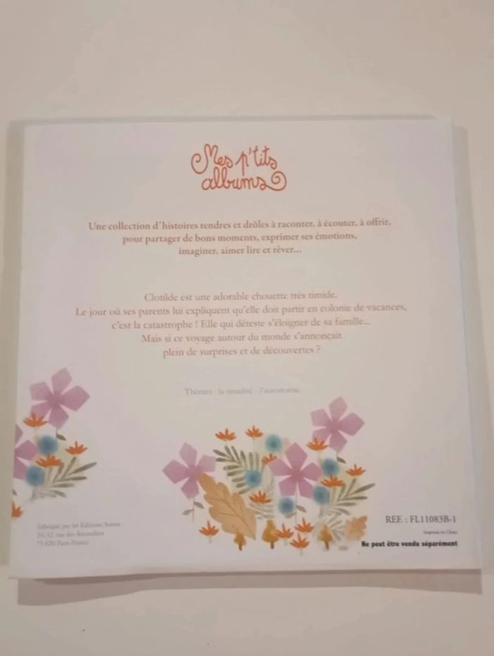 Clotilde est une adorable chouette très timide. Le jour où ses parents lui proposent de partir en colonie de vacances, c’est la catastrophe ! Elle qui déteste s’éloigner de sa famille et de ses habitudes... Le grand départ arrive et Clotilde est bien obligée de suivre le groupe. Mais cette colonie autour du monde s’annonce pleine de surprises et surtout de découvertes ! Éditeur ‏ : ‎ AUZOU 31 pages Âge de lecture ‏ : ‎ 3 - 6 ans Dimensions ‏ : ‎ 21.5 x 0.6 x 21.5 cm Livre en très bon état Je vends d'autres livres de la même collection #phil_peg_mesptitsalbums ou sur les vacances #phil_peg_vacances #mesptitsalbums #colonie #vacances