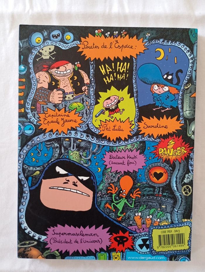 Dix histoires géniales de Sardine de l'espace ! Toute la bande encore réunie pour : retrouver la femme du rêve de Tonton Epaule Jaune. Empêcher l'horrible loto des nombrils organisé par Supermuscleman. Réconcilier Axel l'accélérateur et Adix le frein. Aider Séraphin à parler en lui servant un jus de mots. Empêcher Supermuscleman de mener « Le Super Débat » politique à sa guise. Quand on se baigne dans l'espace, on risque la chute ! Heureusement, les lecteurs peuvent sauver nos héros. Ali a trouvé le secret pour fabriquer des univers, c'est un liquide qui s'appelle l'Alimonade, et Supermuscleman veut le voler pour en faire commerce. Éditeur ‏ : ‎ Dargaud 104 pages Dimensions ‏ : ‎ 16 x 0.8 x 20.2 cm Livre en excellent état Je vends d'autres livres de la même collection #phil_peg_sardine #sardinedelespace #bdjeunesse
