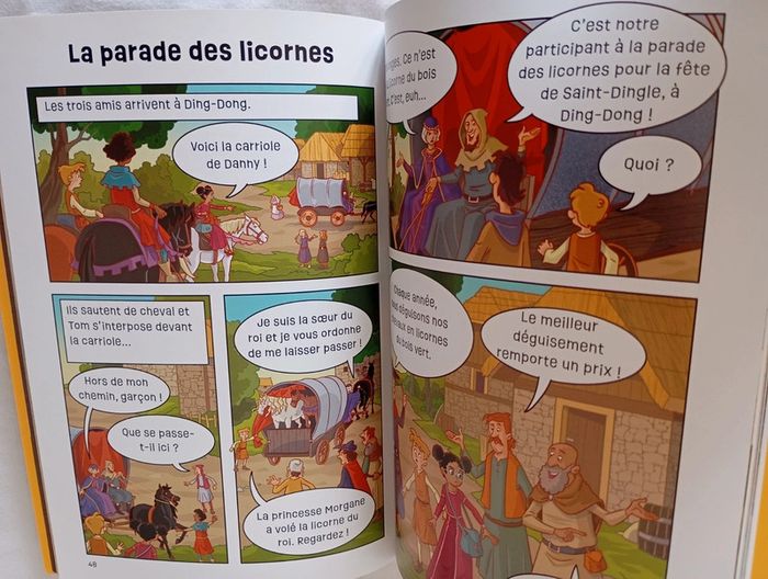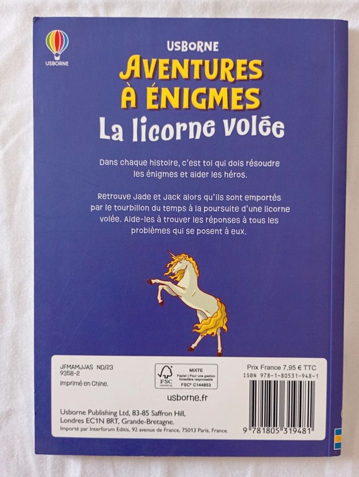 Une histoire avec des énigmes à résoudre qui fera voyager les enfants dans le temps. Dans la cabane de sa tante, Jade découvre toutes sortes d'anciens trésors. Des aventures extraordinaires commencent pour elle lorsqu'elle remonte le temps jusqu'au Moyen Âge pour retrouver la trace d'une licorne qui a été enlevée. Les énigmes à résoudre au fil des pages invitent les lecteurs à aider Jade et son ami Jack à accomplir leur mission. Éditeur ‏ : ‎ Usborne 80 pages Âge de lecture ‏ : ‎ 7 - 9 ans Dimensions ‏ : ‎ 15.2 x 0.7 x 21.2 cm Livre en excellent état Je vends d'autres livres ou cahiers de jeux #phil_peg_cahierjeux #licorne #énigmes