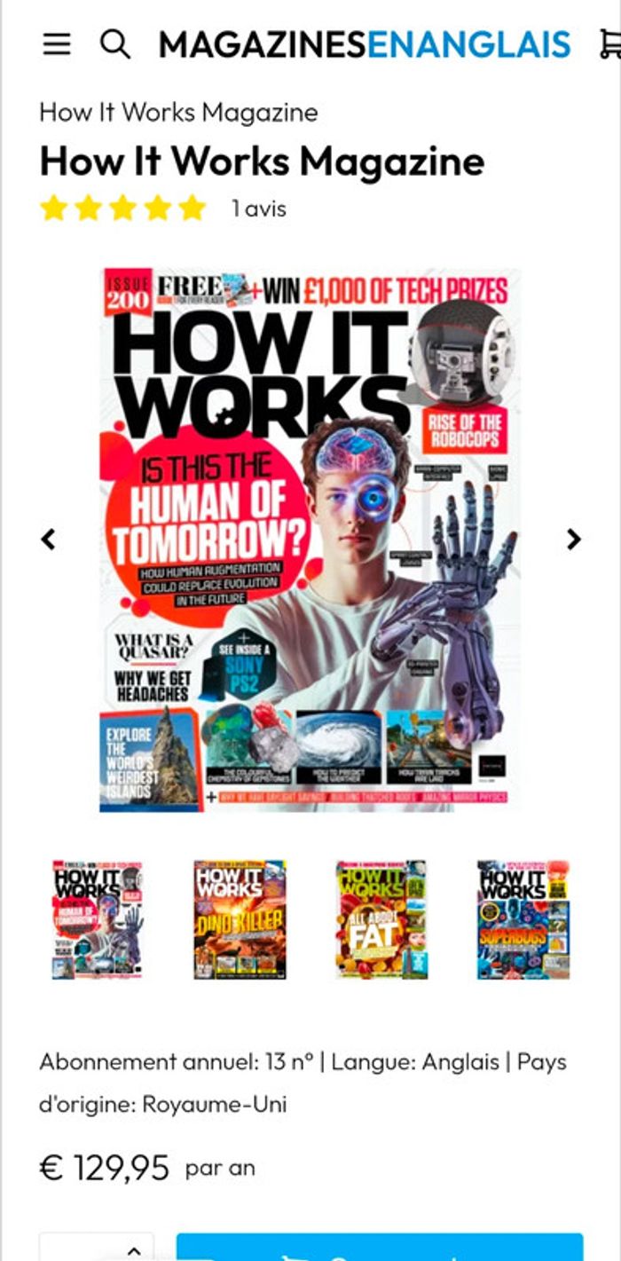 Ce magazine, rédigé en anglais et publié au Royaume-Uni, s'adresse aux curieux de tous horizons. Avec 13 numéros par an, How It Works couvre des sujets variés tels que la science, la technologie, le transport, l'espace, l'histoire et l'environnement. Cet abonnement est pour la version imprimée, garantissant une lecture agréable et tactile de chaque édition.