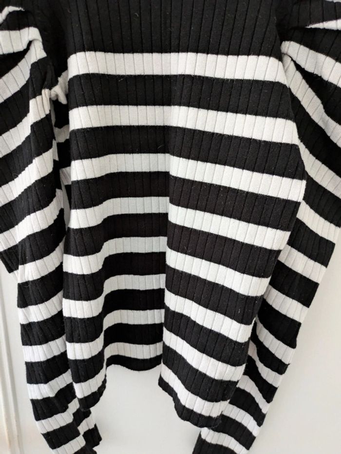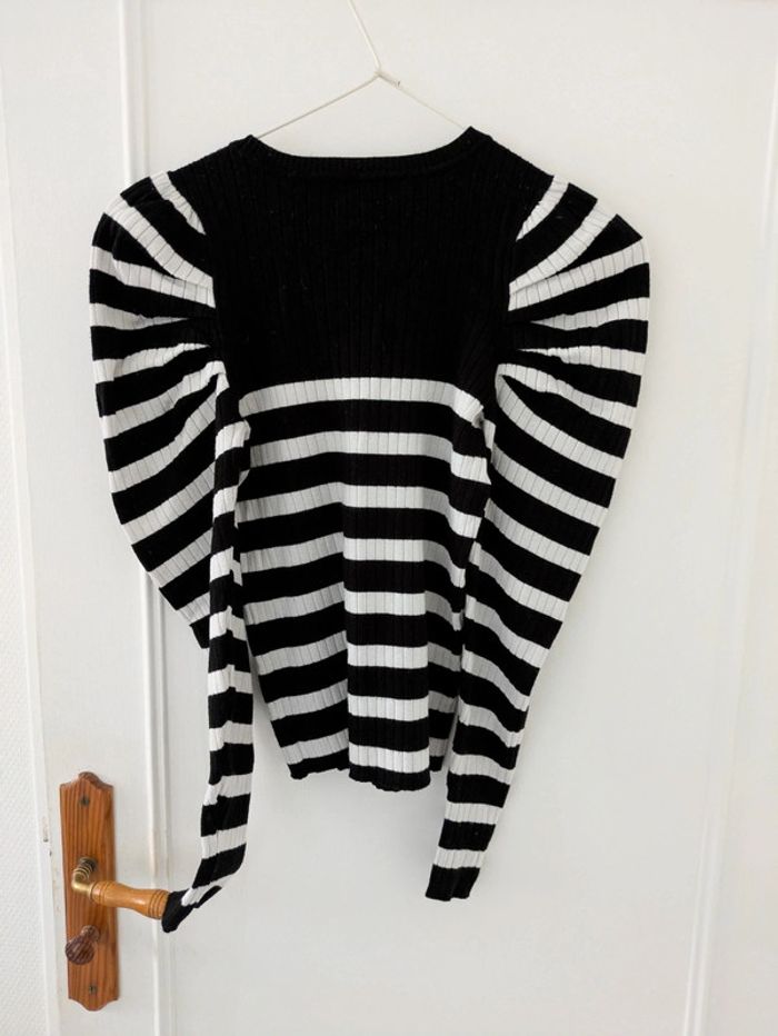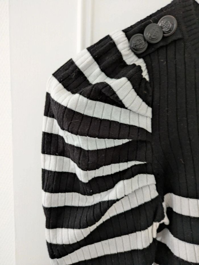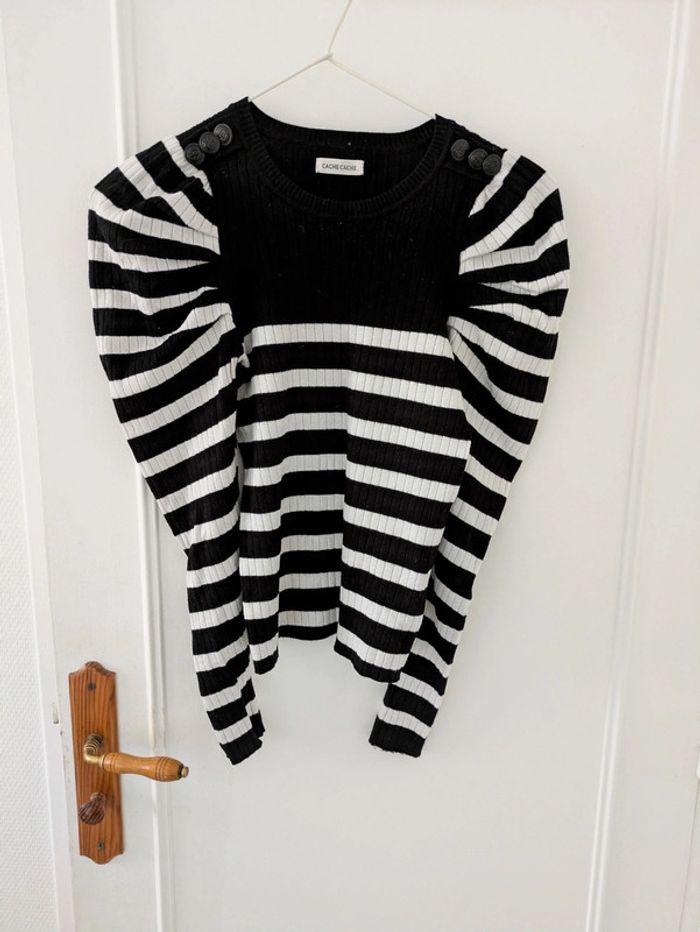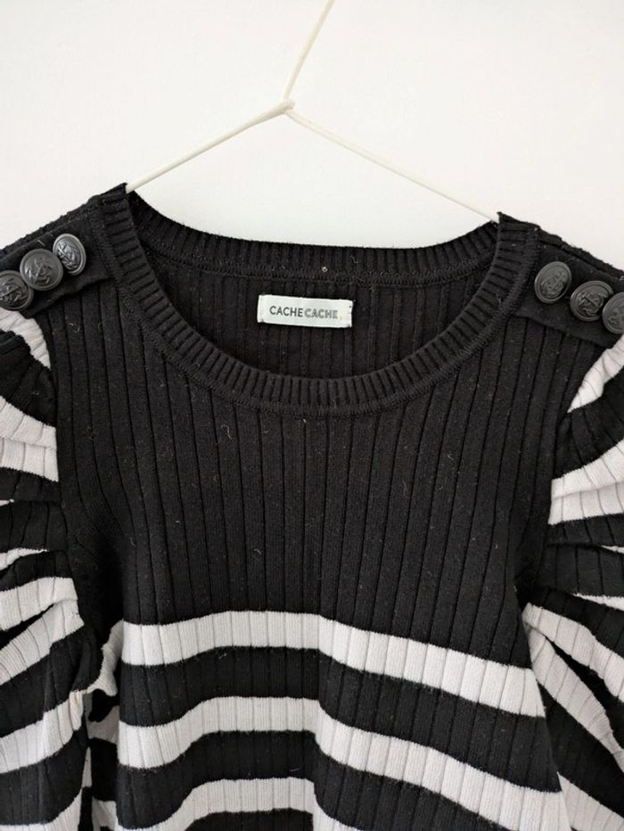 Pull femme marque cache cache taille XS marinière avec boutons décoratifs sur les épaules à rayures noir et crème, manche froncées, modèle très sympa. Mes autres annonces de même taille #joeypotter91_femmetaille34 #joeypotter91_fillequatorzeans (La taille XS est généralement équivalente à du 14 ans fille dans le prêt-à-porter) [Sac T32 et 34]