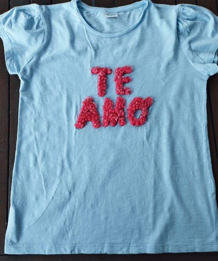 Beau petit tee-shirt avec brodé "Te Amo" sur la poitrine Marque Tape à l'oeil Taille 14ans Très bon état Pensez à regarder mes autres ventes, beaucoup de marques à petits prix et toutes tailles.