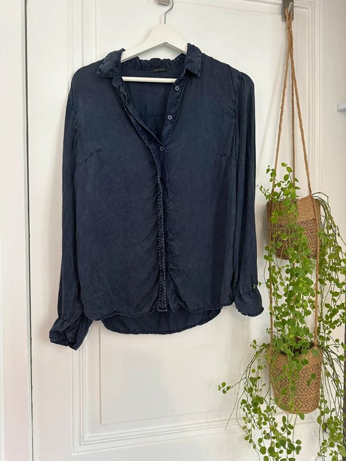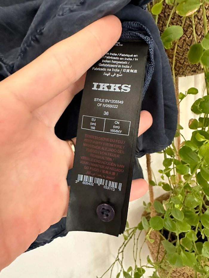 Chemise IKKS bleu foncée effet légèrement chiné. En cupro taille 36 Portée 2 fois. Vente parce qu’il faut repasser et j’ai horreur de ça. (Pas repassée pour les photos) Valeur neuve l’an passé : 140 euros