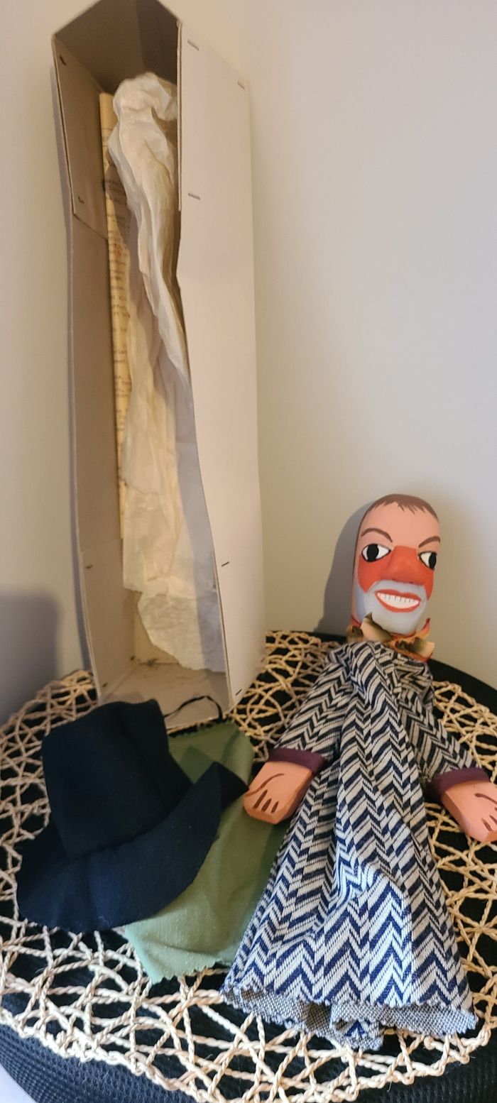 Marionnette de guignols en bois pratiquement neuve dans sa boîte d’origine sans couvercle avec certificat d’authenticité Acheté dans les années 70 Longueur 35 cm