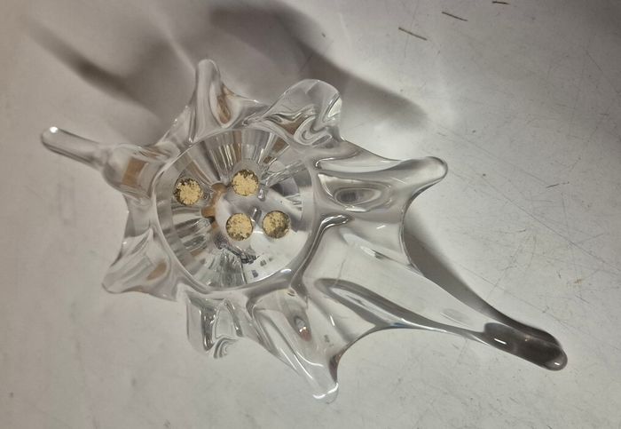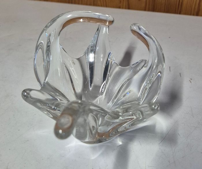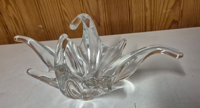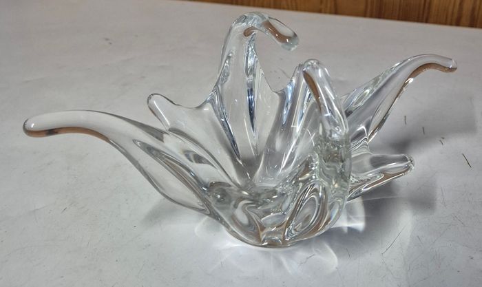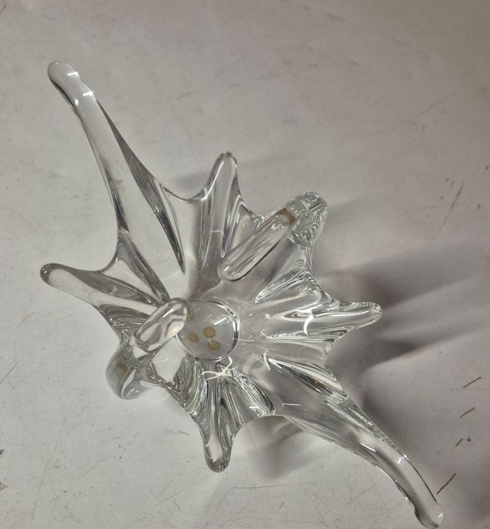 Centre de table ou coupe décorative en cristal soufflé transparent, à forme libre avec pointes étirées. Aucune signature visible, mais la pièce est lourde, très brillante et présente des caractéristiques proches des productions du Cristal de Vannes des années 60-70. Dimensions : • Longueur : 26 cm • Largeur : 12 cm • Hauteur : 13 cm Tres bon, pas d’éclat ni de fissure. Idéal comme objet décoratif, vide-poche ou coupe à fruits.