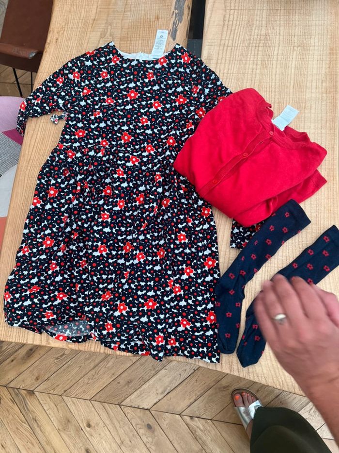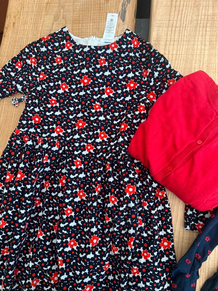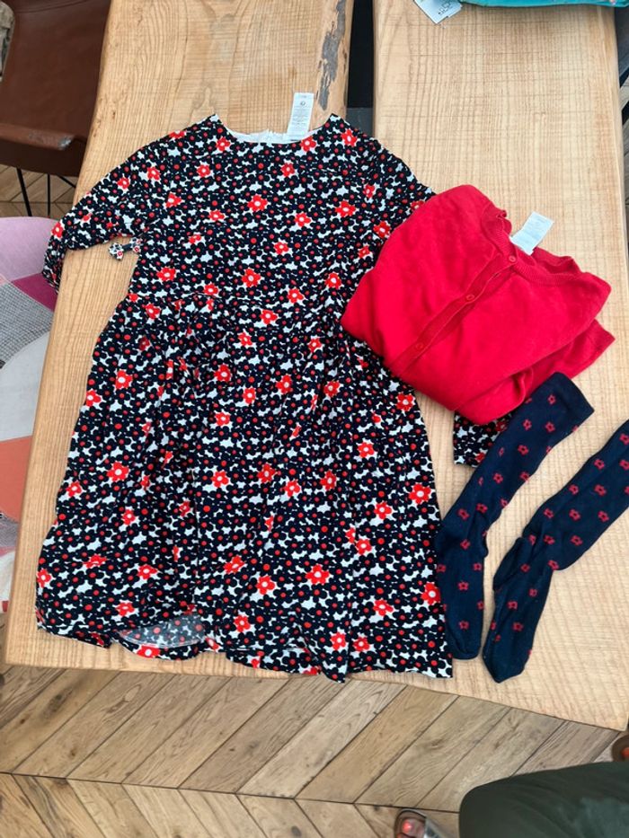 Ensemble d’hiver Jacadi Gilet et robe en velours lisse Chaussettes hautes+ barrette offerte Le tour du même thème à fleurs et festons Prix fixe