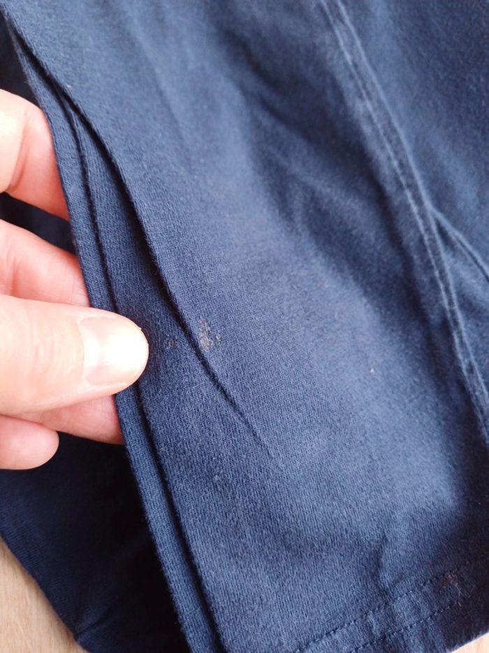 bon état. Le bleu marine à perdu un peu de sa couleur avec les lavages successifs. Un petite tâche de peinture sur le bras.