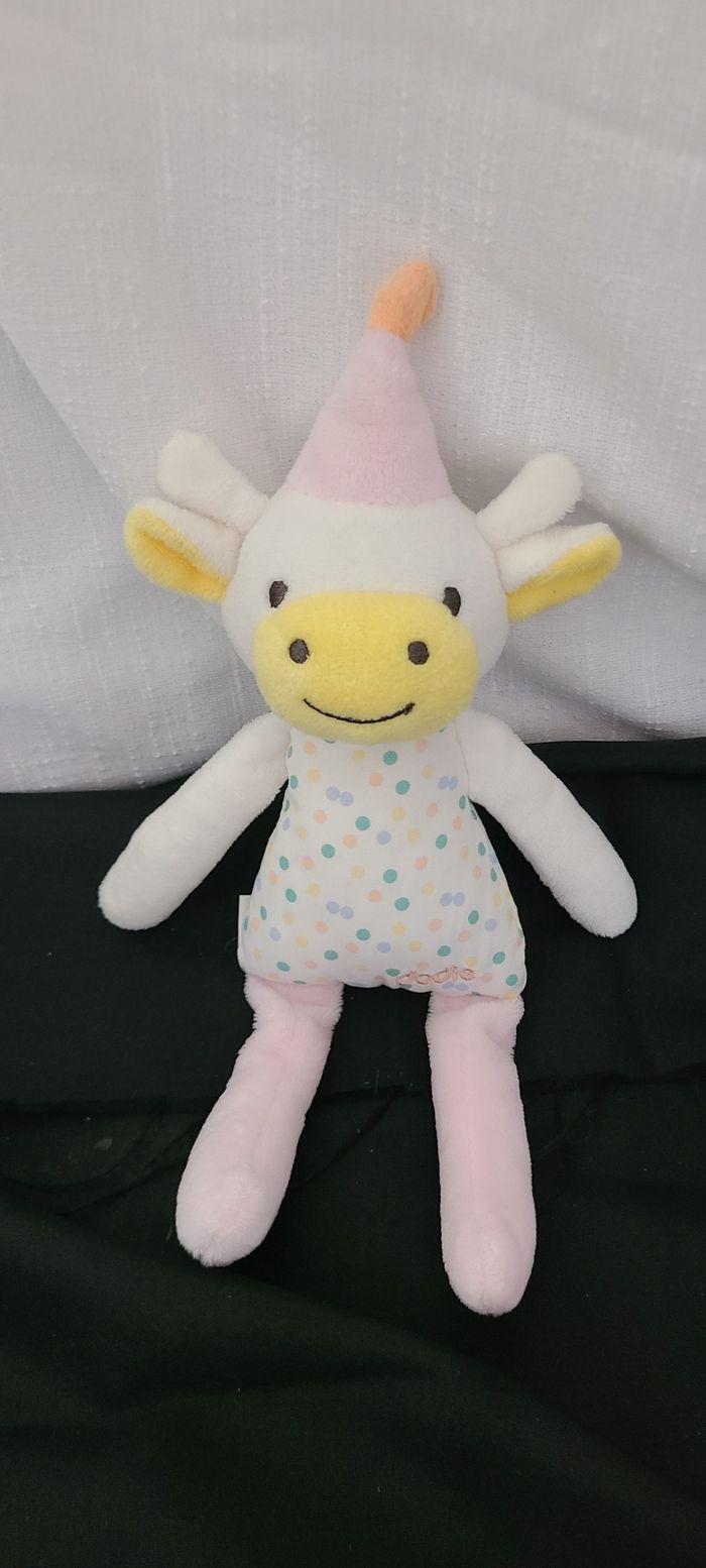 Doudou peluche vache DODIE 26 cm blanc rose jaune chapeau et corps tissu à pois - photo numéro 1