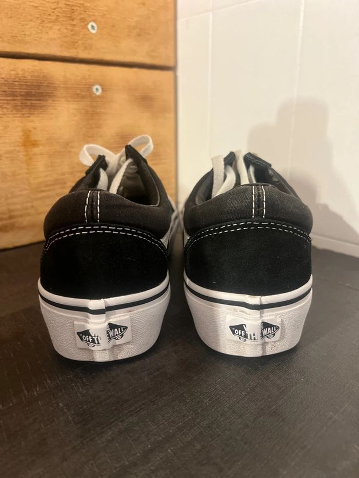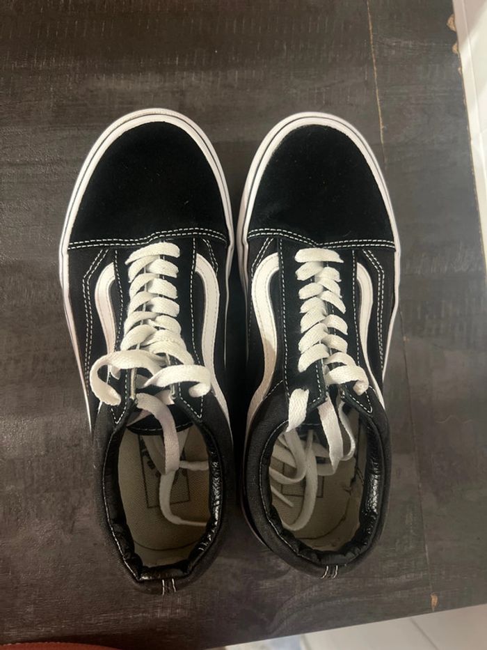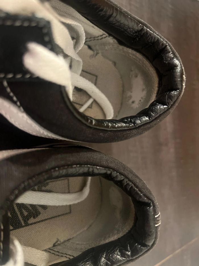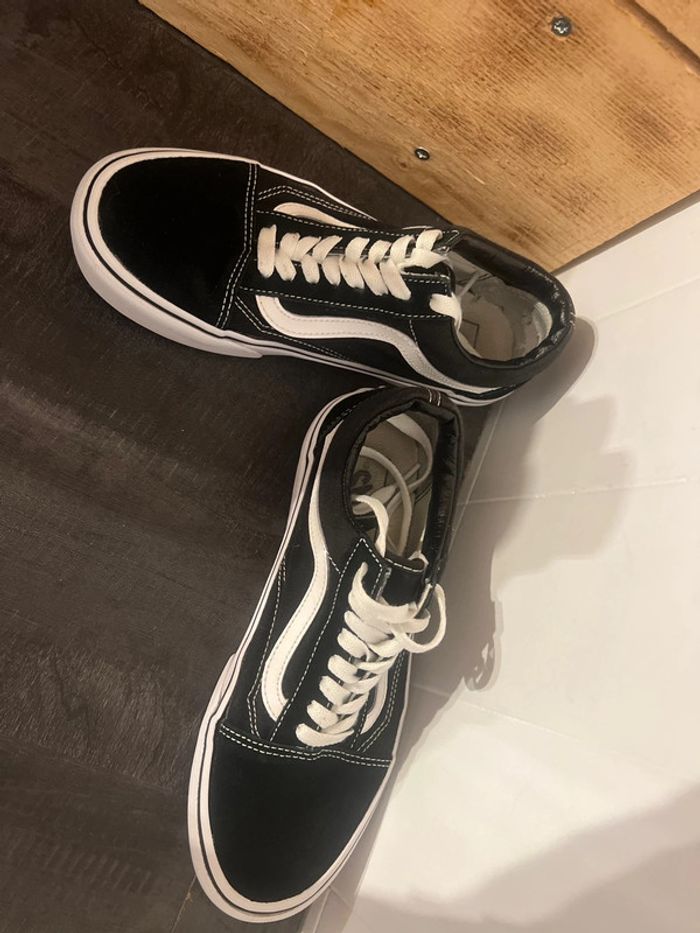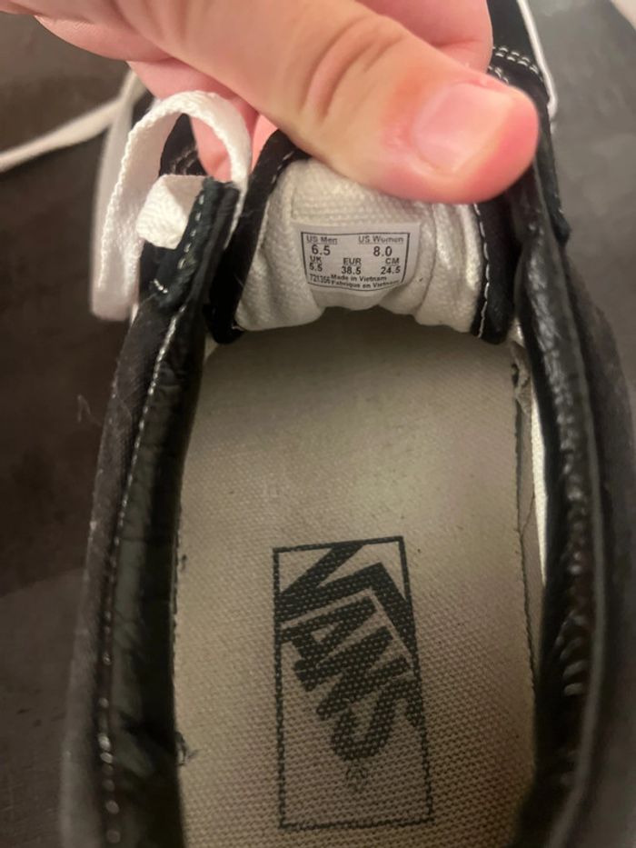Vans noir en bon état. Pas de tache pas de trou à part un peu d’usure à l’intérieur voir photo. Pointure 38.5