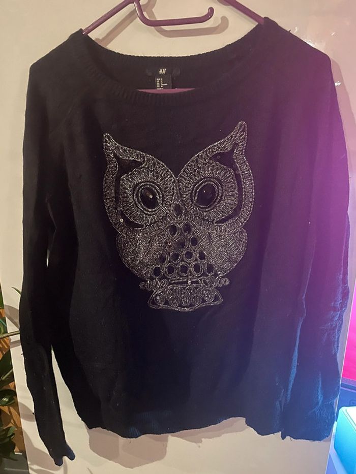 Pull avec hibou perles et strass Un peu bouloché Taille M sur l’étiquette mais correspond plus à un L