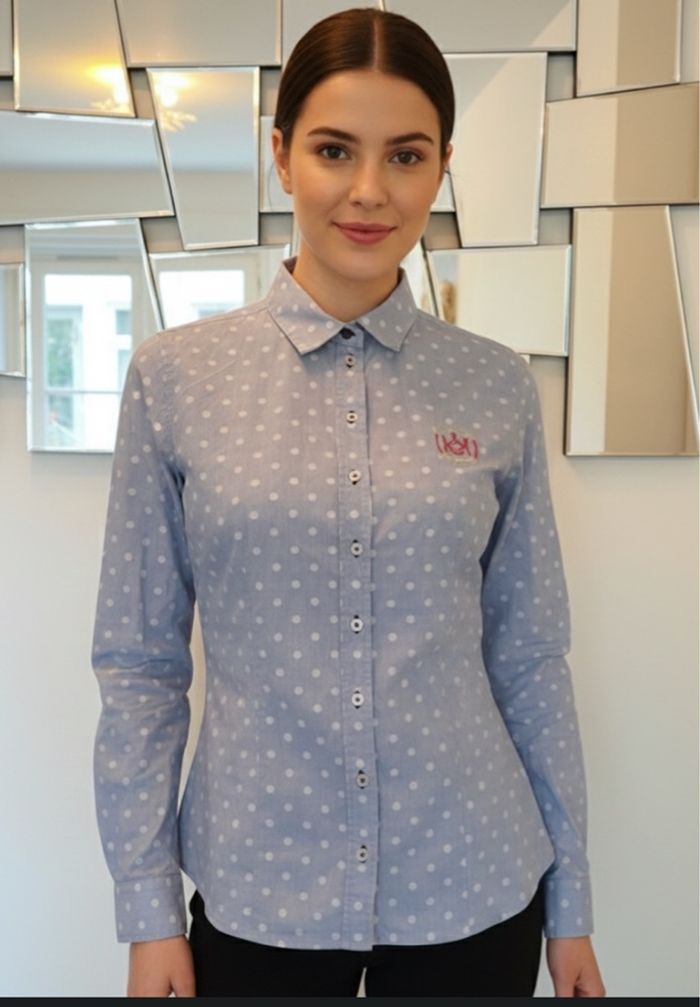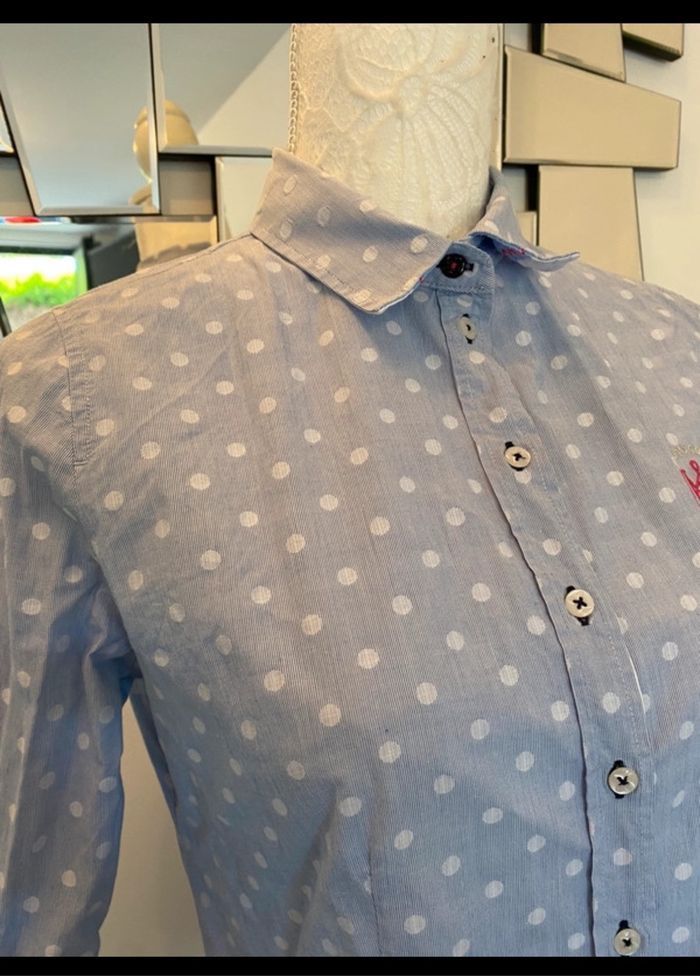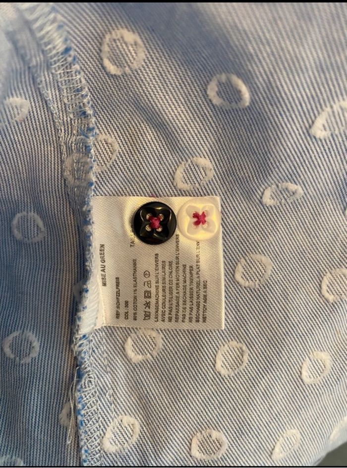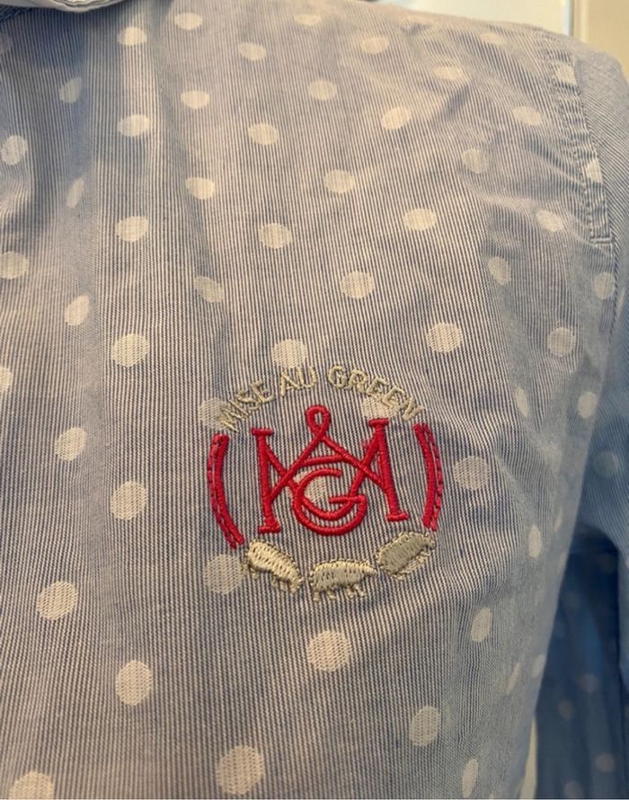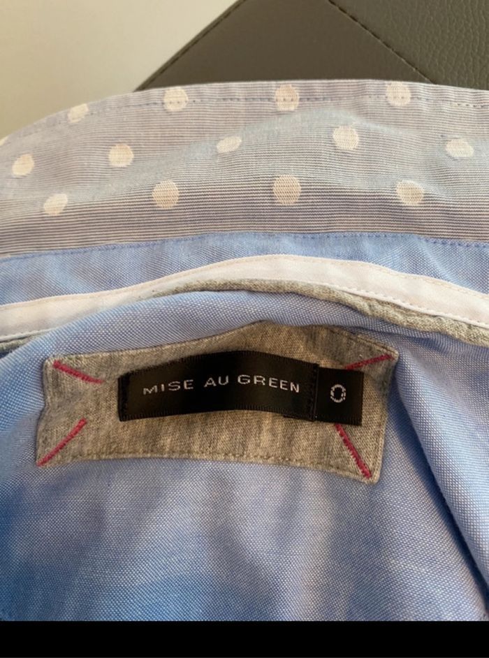 🌸 Chemise de la marque Mise au Green ,Parfaite pour un look élégants et chic. Belle coupe, confortable et stylée. 🔖 Matière : 99% coton 📌 Marque : Mise au Green 📏 Taille : 0 = 34 🎨 Couleur : bleu avec point blanc 🧵 Détails : Logo Mise au Green brodé 👍 Bouton de secours