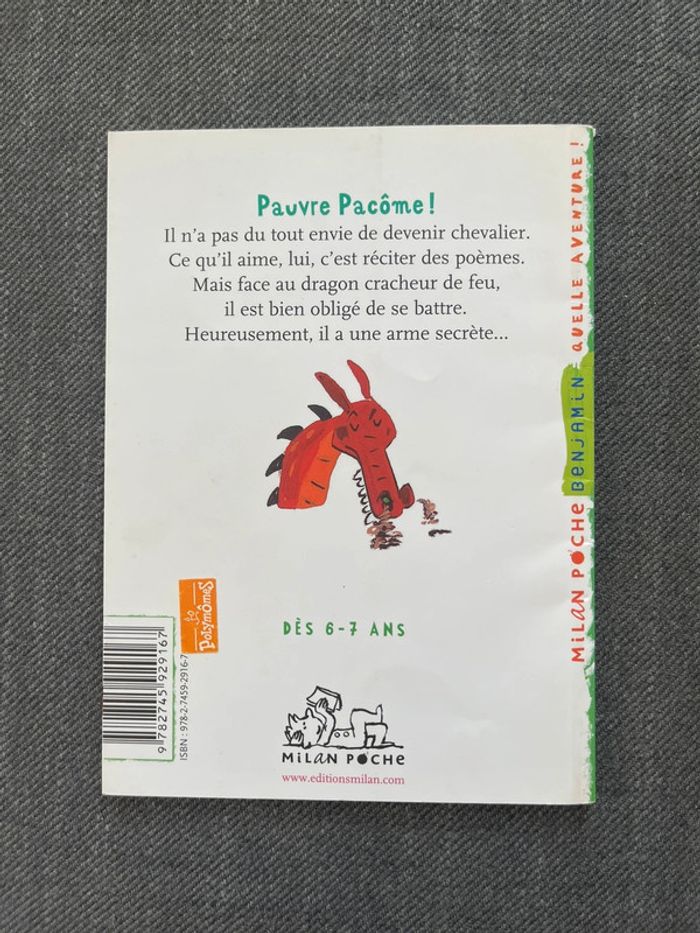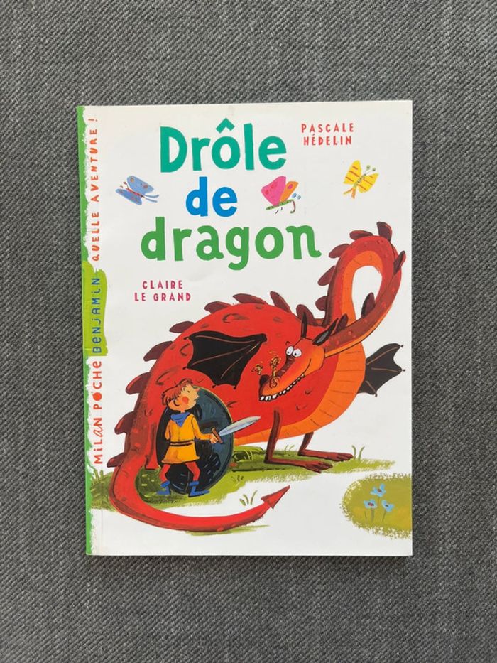 Titre : Drôle de dragon Auteure : Pascale Hedelin Illustratrice : Claire Le Grand Collection : Benjamin, Quelle aventure ! Éditeur : Milan poche Âge : 6-7 ans - Premières lectures Résumé : Pacôme passe toutes ses journées à aider son maître, le vaillant chevalier Godefroy. Mais, lorsque l'on est rêveur et sensible, il n'est pas facile d'être l'écuyer d'un grand chevalier. Surtout lorsqu'il faut partir combattre un dragon terrifiant... D’autres livres, jeux et vêtements disponibles, n’hésitez pas à faire un lot (jusqu’à 15% de réduction) ☺️
