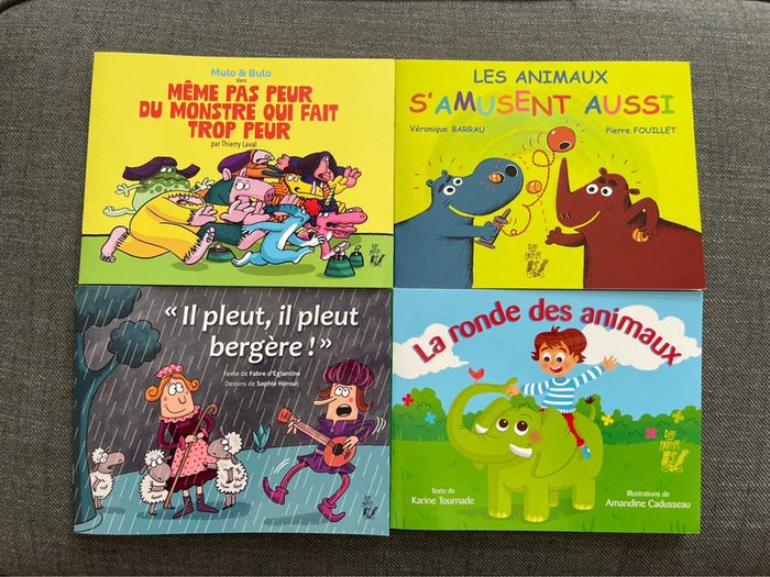 Lot de 4 livres neufs comprenant : - « Il pleut, il pleut bergère ! » de Fabre d’Eglantine et Sophie Herout - La ronde des animaux de Karine Tournade et Amandine Cadusseau - Mulo & Bulo dans Même pas peur du monstre qui fait trop peur par Thierry Laval - Les animaux s’amusent aussi de Véronique Barrau et Pierre Fouillet D’autres livres, jeux et vêtements disponibles, n’hésitez pas à faire un lot (jusqu’à 15% de réduction) ☺️
