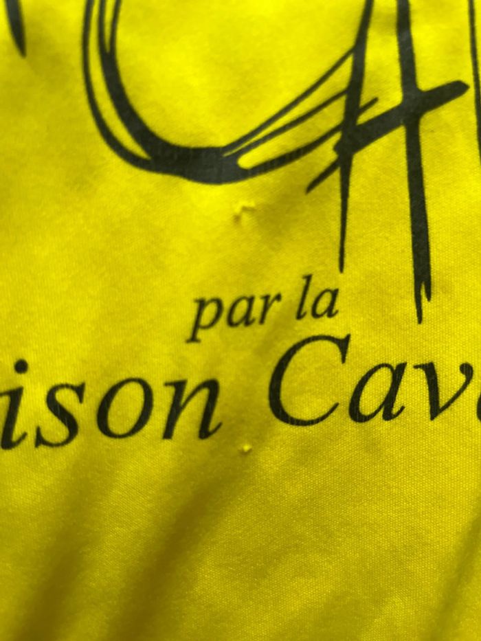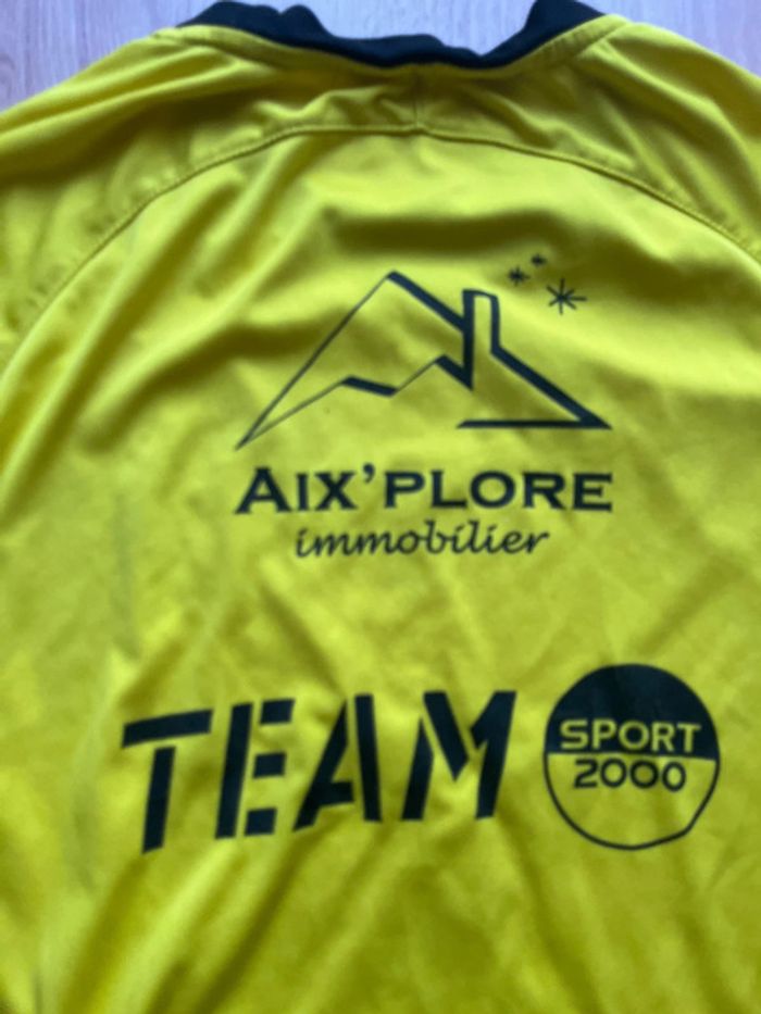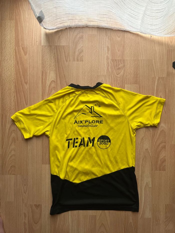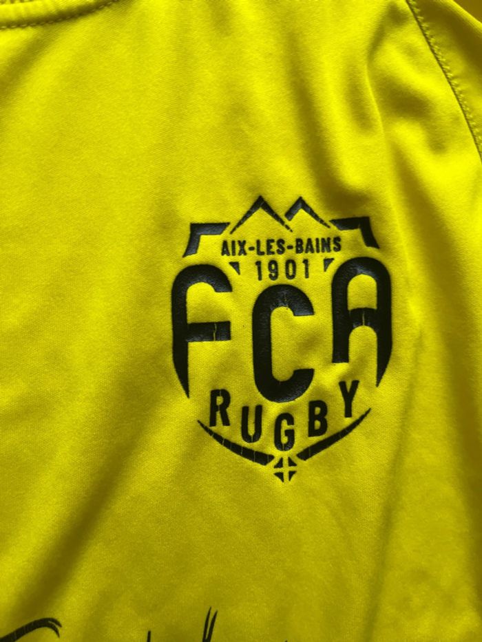 Tee shirt du club de rugby du FC AIX LES BAINS de la marque Vestiaire du Sport . Taille XS enfant . Couleur jaune et noir . Bon état, quelques mailles tirées voir photo 4