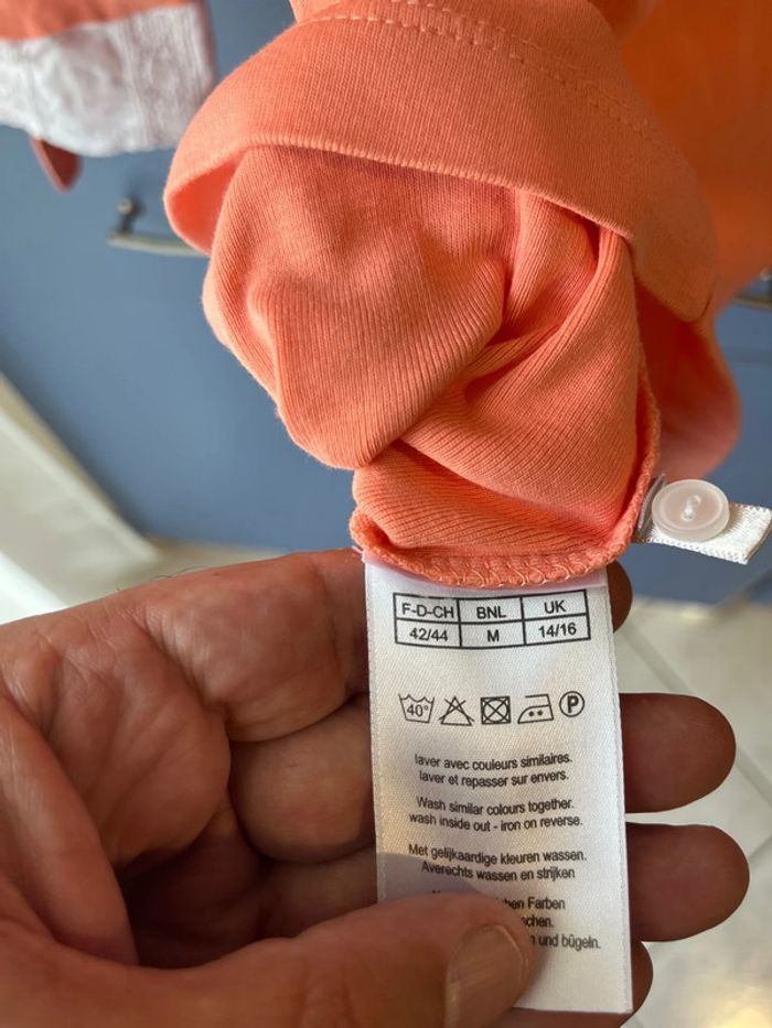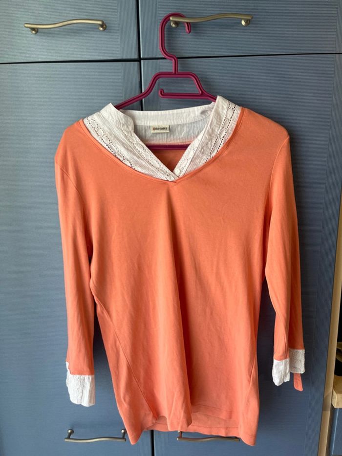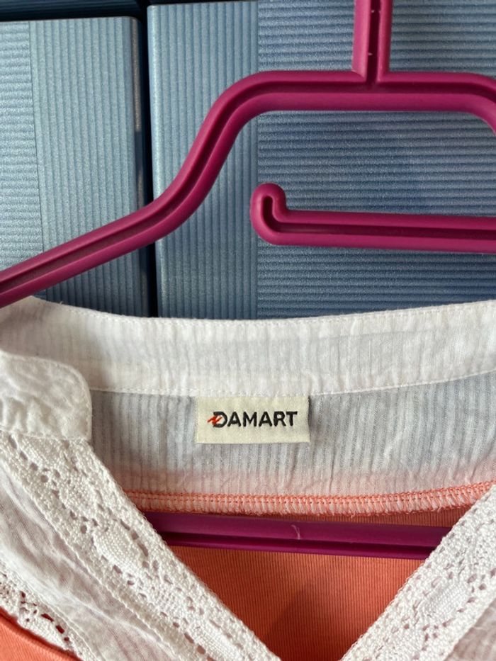 Magnifique tunique de la marque Damart. Couleur saumon et Blanc. Taille 42-44 . Excellent état