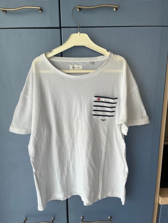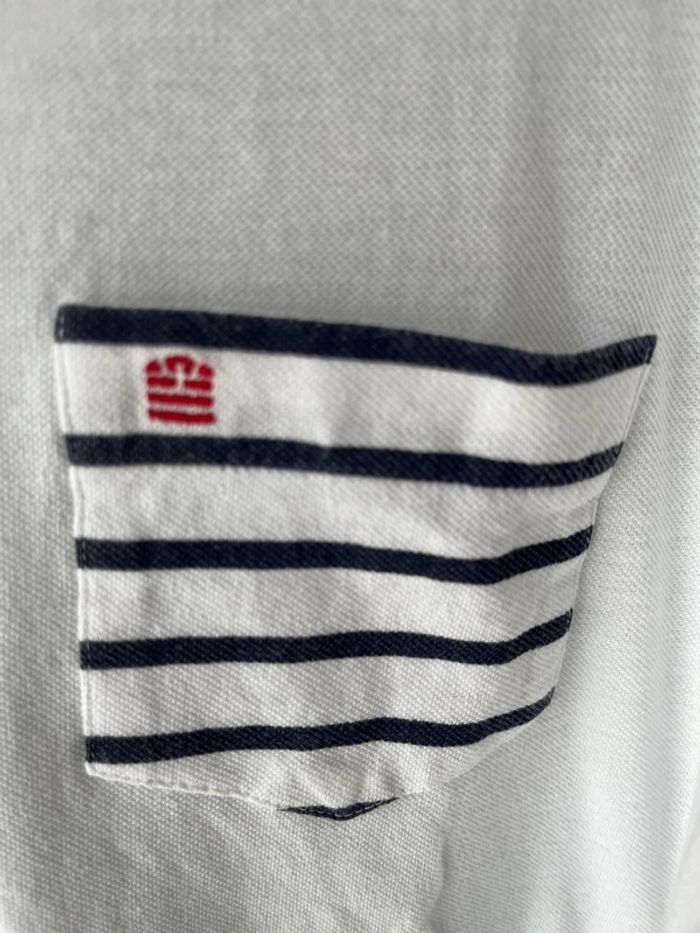 T-shirt homme Serge Blanco. Taille L. Blanc avec une poche sur le cœur couleur marinière. Excellent état. Preuve d’authenticité Serge Blanco sur les photos.
