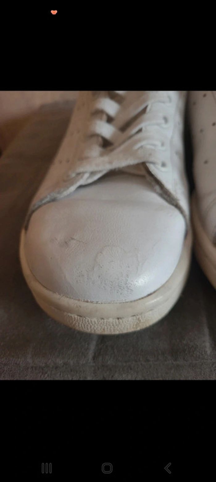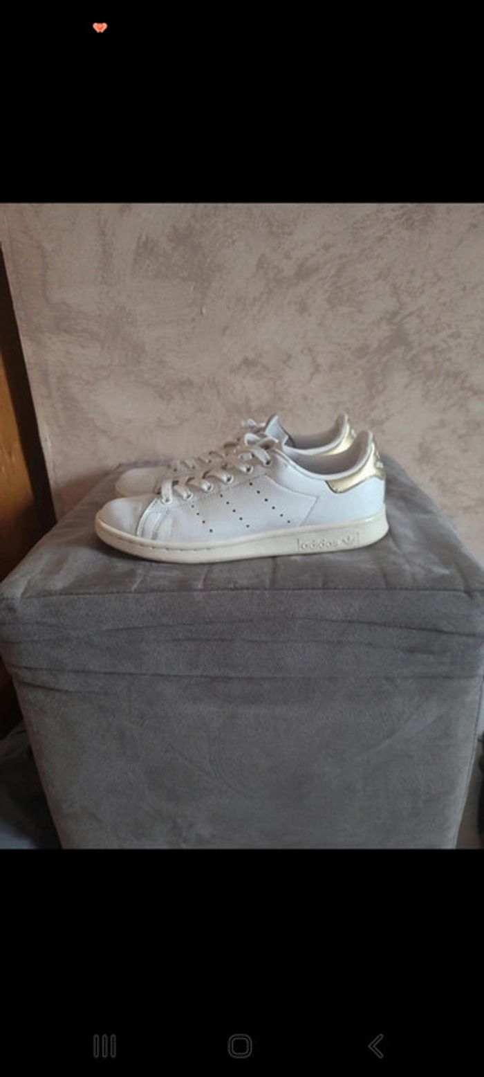 Baskets Adidas Stan Smith blanches et dorée. Légèrement usées sur l'avant voir photos 4 et 5. Pointure 37,5 . Étiquette d'authenticité Adidas. Envoi sous 48h